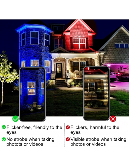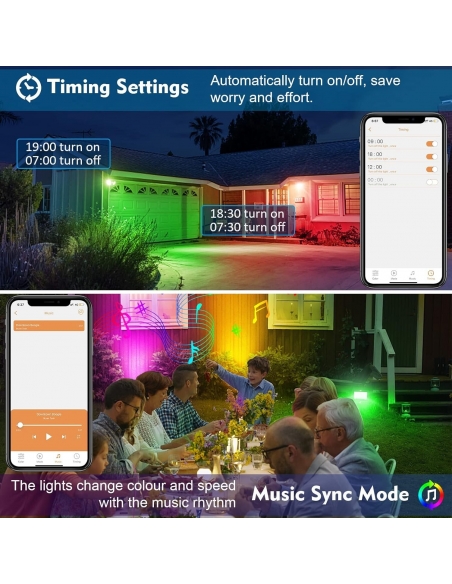 Festa del fine settimana? Faretto LED da Esterno RGB possono cambiare colore e velocità in base al ritmo di qualsiasi canzone.Il sistema Android importerà automaticamente la musica dai file locali del telefono e il sistema Apple utilizzerà la musica in Apple Music.