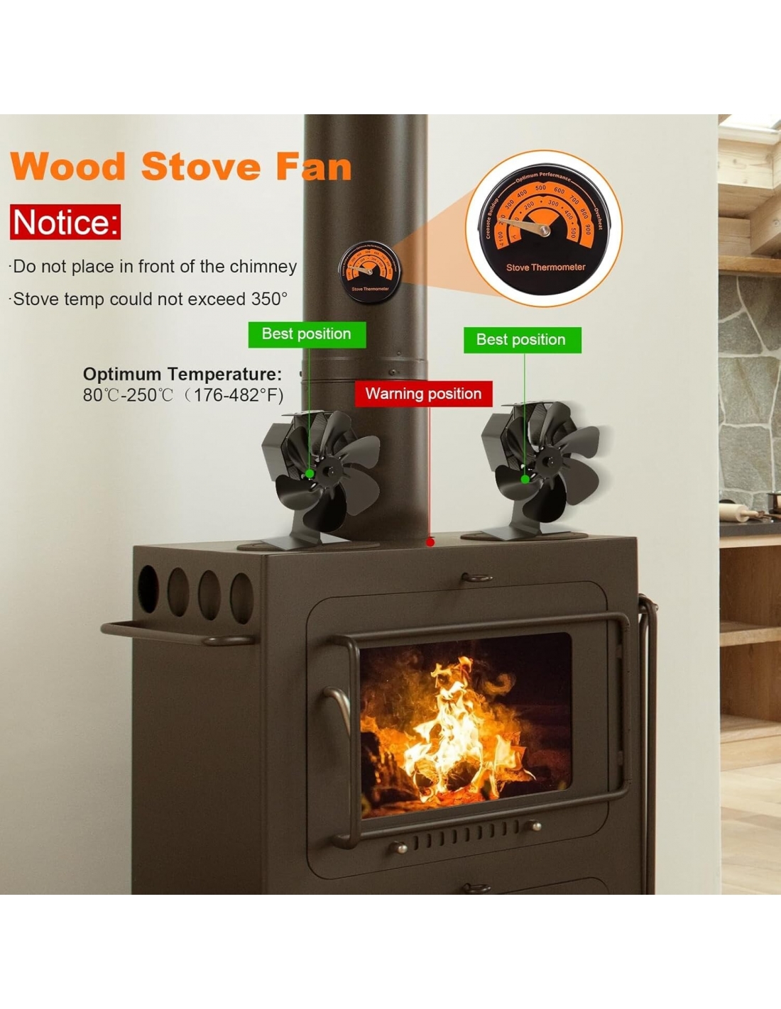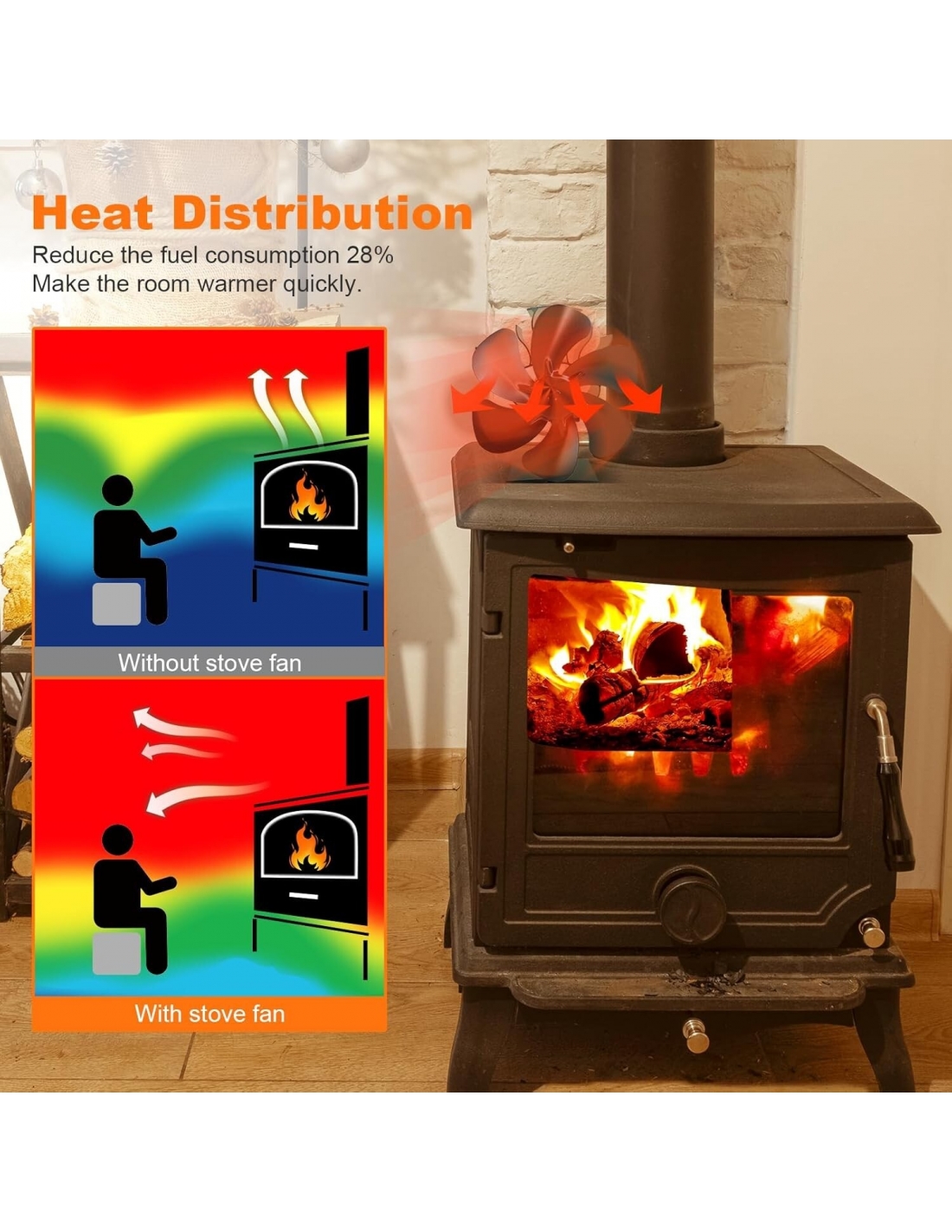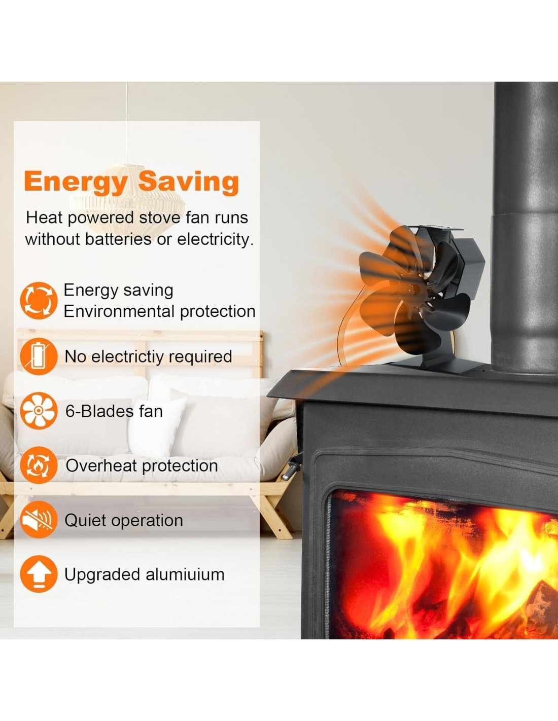 - Non richiede batterie o elettricità! La ventola della stufa è alimentata dal calore del camino o della stufa a legna, facendo circolare efficacemente l'aria calda nella stanza. Aumenta l'efficienza del forno indipendente o della stufa a legna/ceppi per generare calore in modo economico, aiutandoti a risparmiare sulle bollette.