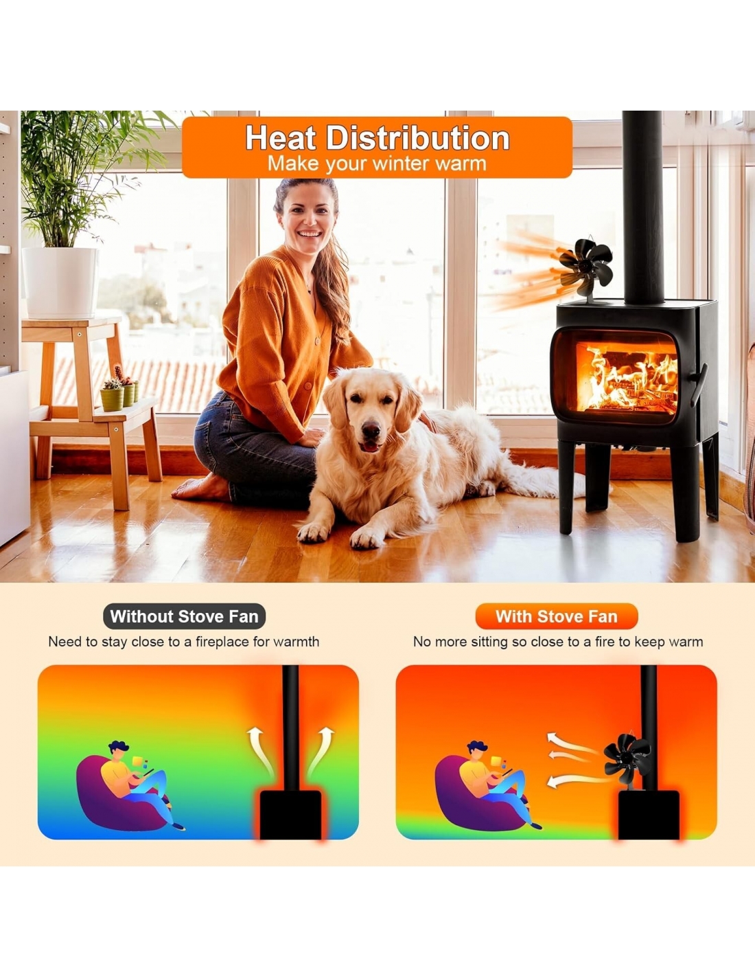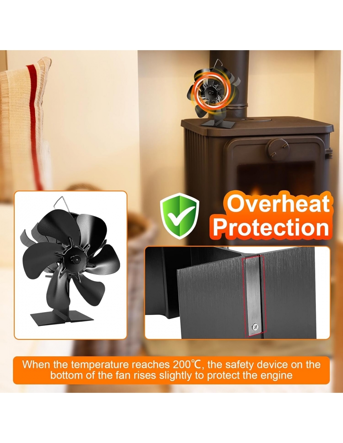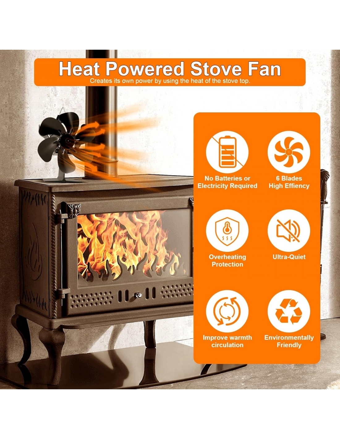 - Risparmio energetico: non richiede batterie o elettricità! La ventola della stufa è alimentata dal calore del camino o della stufa a legna, facendo circolare efficacemente l'aria calda nella stanza. Aumenta l'efficienza del forno indipendente o della stufa a legna/ceppi per generare calore in modo economico, aiutandoti a risparmiare sulle bollette.