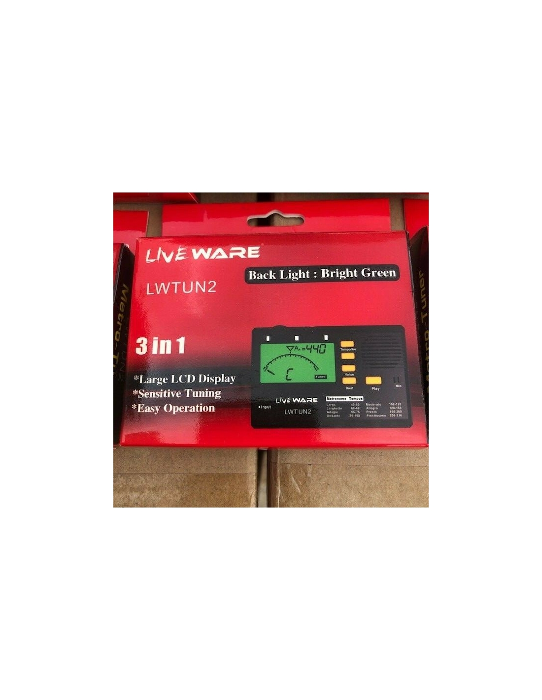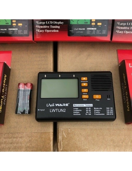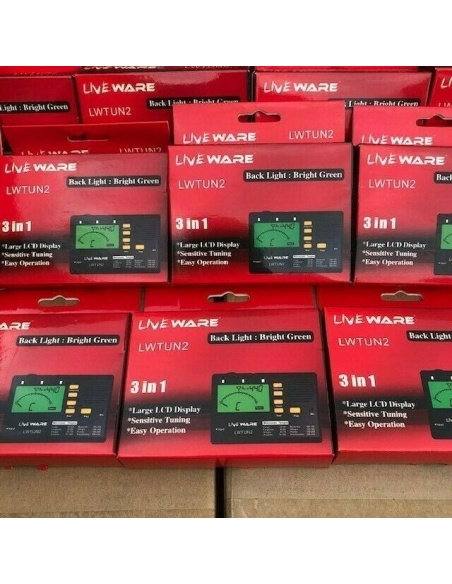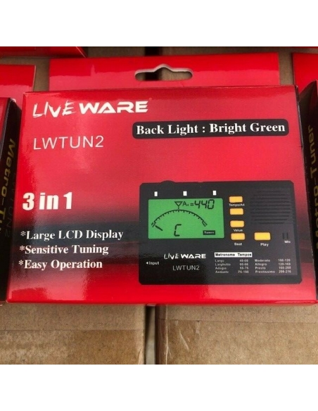 Liveware LWTUN2 è un accordatore conveniente e facile da usare con metronomo integrato e pratico display LCD retroilluminato in modo che il display possa essere facilmente letto su palchi poco illuminati. Accorda con precisione grazie al microfono sensibile e ai complessi componenti interni. Modalità tempo metronomo: 30 - 280 BPM. Dispone di un ingresso jack da 6,35 mm e un ingresso mini jack per cuffie con controllo del volume.