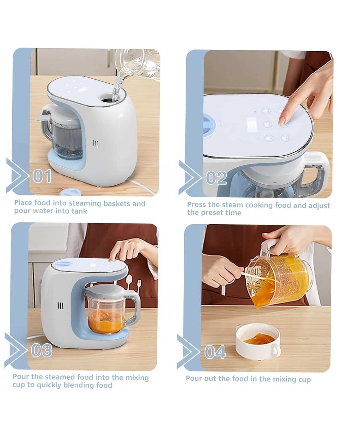 - Dotato di un pannello di controllo LCD e di un facile touch screen, è possibile selezionare le impostazioni e il tempo di cottura del robot cuoci pappa che si desidera. Basta premere la funzione desiderata e attendere il cibo finito. Il vaso di miscelazione può essere lavato in lavastoviglie, risparmiando così più tempo per accompagnare il bambino e la famiglia