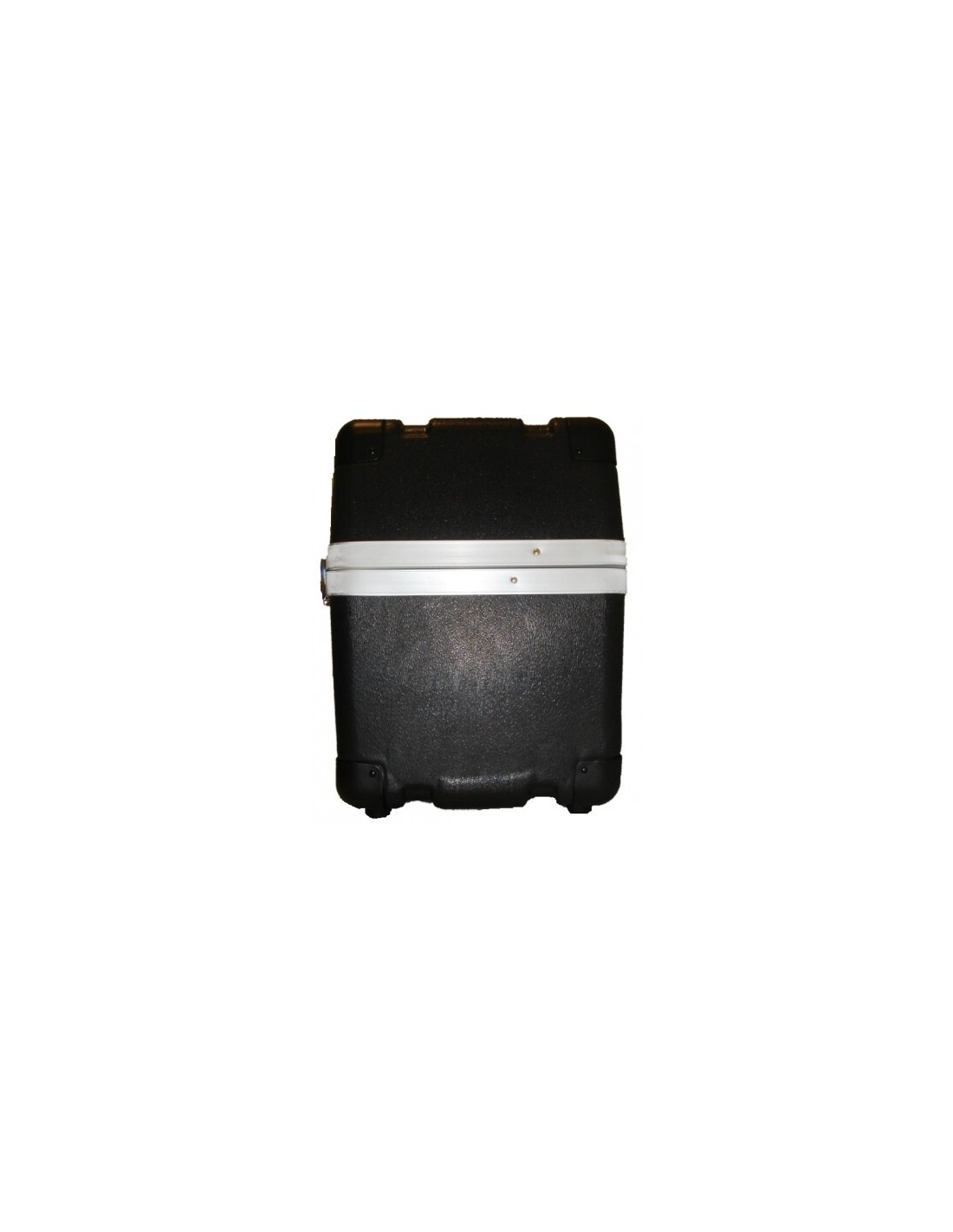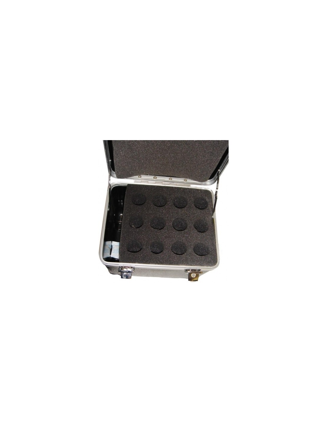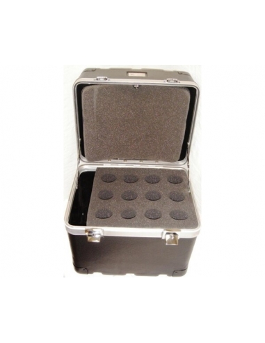 Robusta custodia rigida in ABS di colore nero, con fori in spugna sagomati per contenere 12 microfoni dotata di ampio vano porta cavi più ripostiglio lato superiore sotto il coperchio.