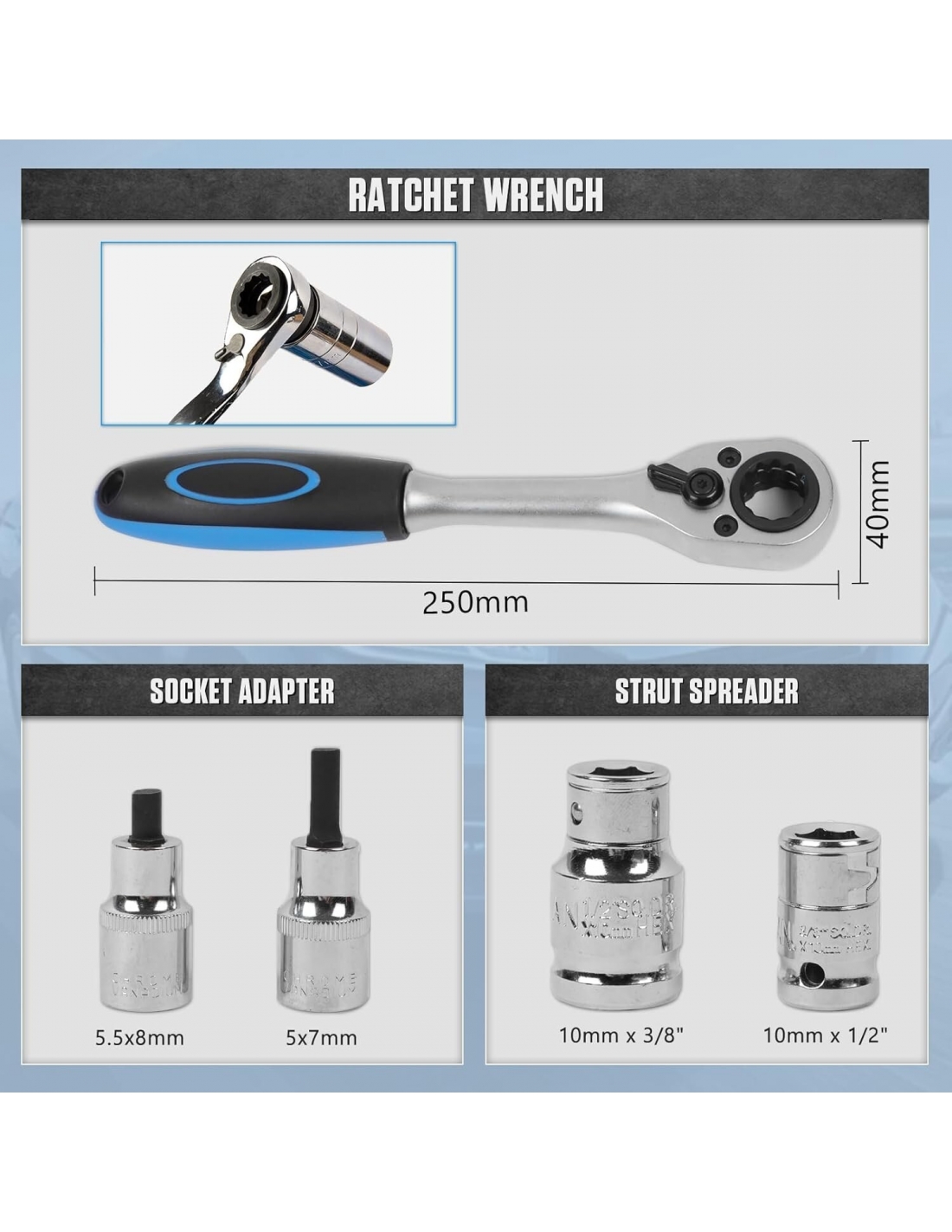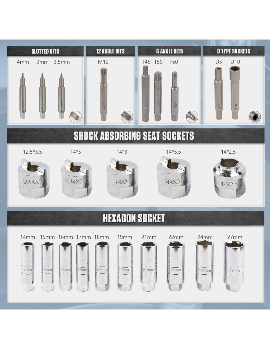 - Ampia gamma di prese: lo strumento ammortizzatore per il montaggio e lo smontaggio del montante della sospensione include: 1 chiave dinamometrica; 2 adattatori (1/2 x 10 mm e 3/8 x 10 mm); 10 bussole esagonali lunghe (14/15/16/17/18/19/21/22/24/27 mm). 5* 5* 5* damRecording (10,5*3,5/12,5*3,5/14,5*5/14,5*3/14*2,5 mm); 2 adattatori extra; 3 tipi speciali (T45/T50/T60); 1 fiore M12; 5 bussole esagonali (7/8/9/10/11 mm); 4 bussole esagonali (H5/H6/H7/H8); 3 bussole a testa piatta (3/3,5/4 mm); 9 x prese oblate