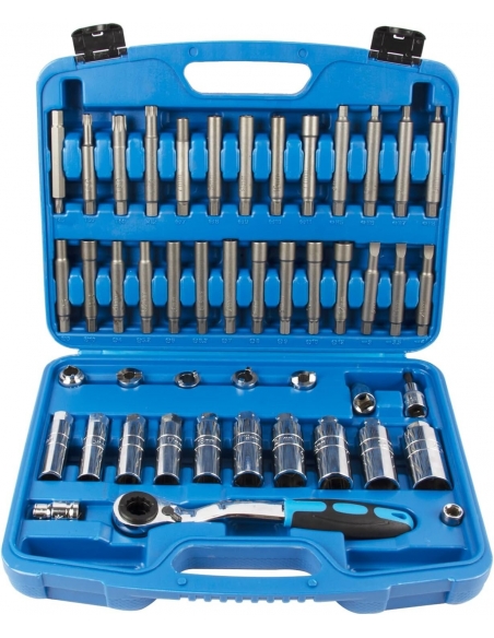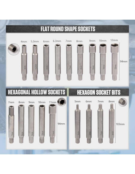 - Ampia gamma di prese: lo strumento ammortizzatore per il montaggio e lo smontaggio del montante della sospensione include: 1 chiave dinamometrica; 2 adattatori (1/2 x 10 mm e 3/8 x 10 mm); 10 bussole esagonali lunghe (14/15/16/17/18/19/21/22/24/27 mm). 5* 5* 5* damRecording (10,5*3,5/12,5*3,5/14,5*5/14,5*3/14*2,5 mm); 2 adattatori extra; 3 tipi speciali (T45/T50/T60); 1 fiore M12; 5 bussole esagonali (7/8/9/10/11 mm); 4 bussole esagonali (H5/H6/H7/H8); 3 bussole a testa piatta (3/3,5/4 mm); 9 x prese oblate