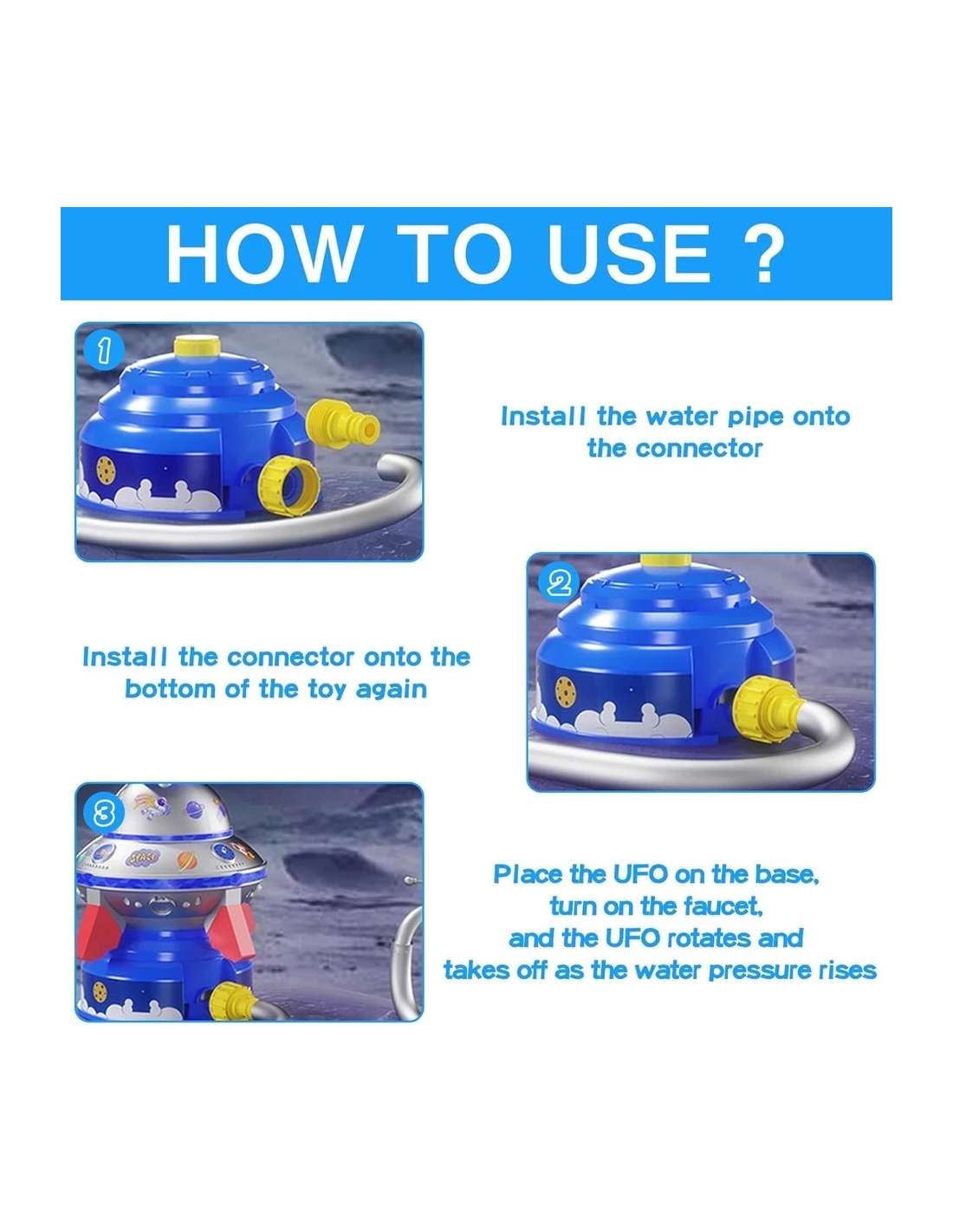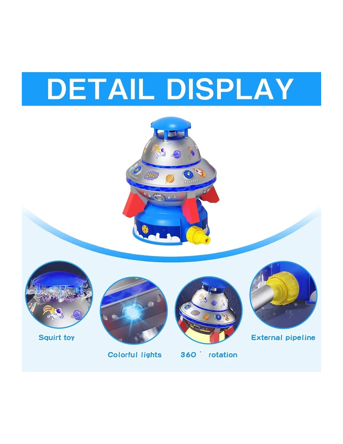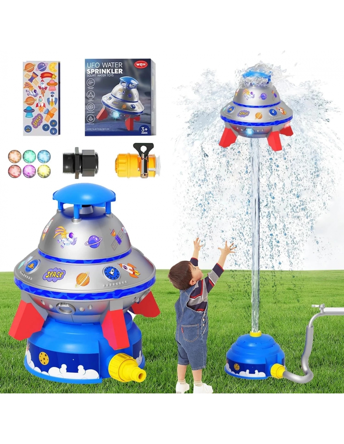 - Giocattolo UFO con Spruzzatore d'Acqua: Gli accessori di questo prodotto includono un connettore per tubo dell'acqua di base e un connettore per rubinetto, 1 raffinata scatola colorata, 2 adesivi raffinati e 6 luci colorate. L'irrigatore a forma di razzo ha un design accattivante che invoglia facilmente i bambini a giocare sul prato, in spiaggia o in piscina. Il tuo bambino può correre, saltare, schivare i getti d'acqua e sentire la freschezza dell'acqua.