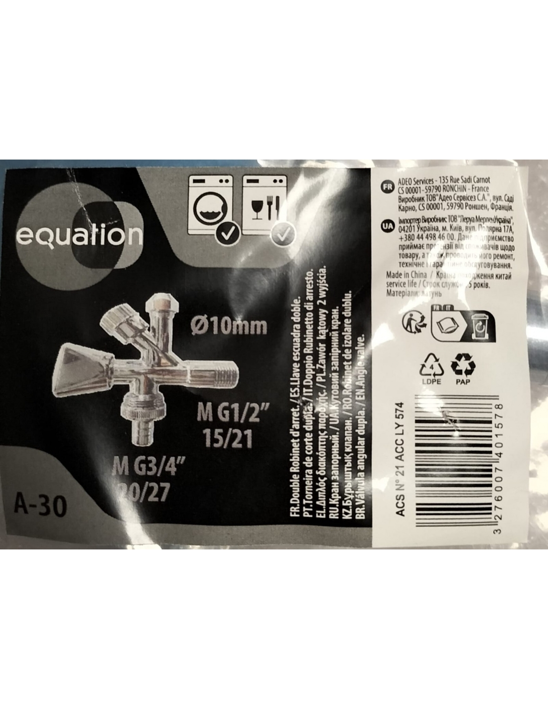 Equation A-30 Doppio rubinetto arresto ottone cromato M G3/4" M G1/2" Diametro 10 mm Lavatrice Lavastoviglie