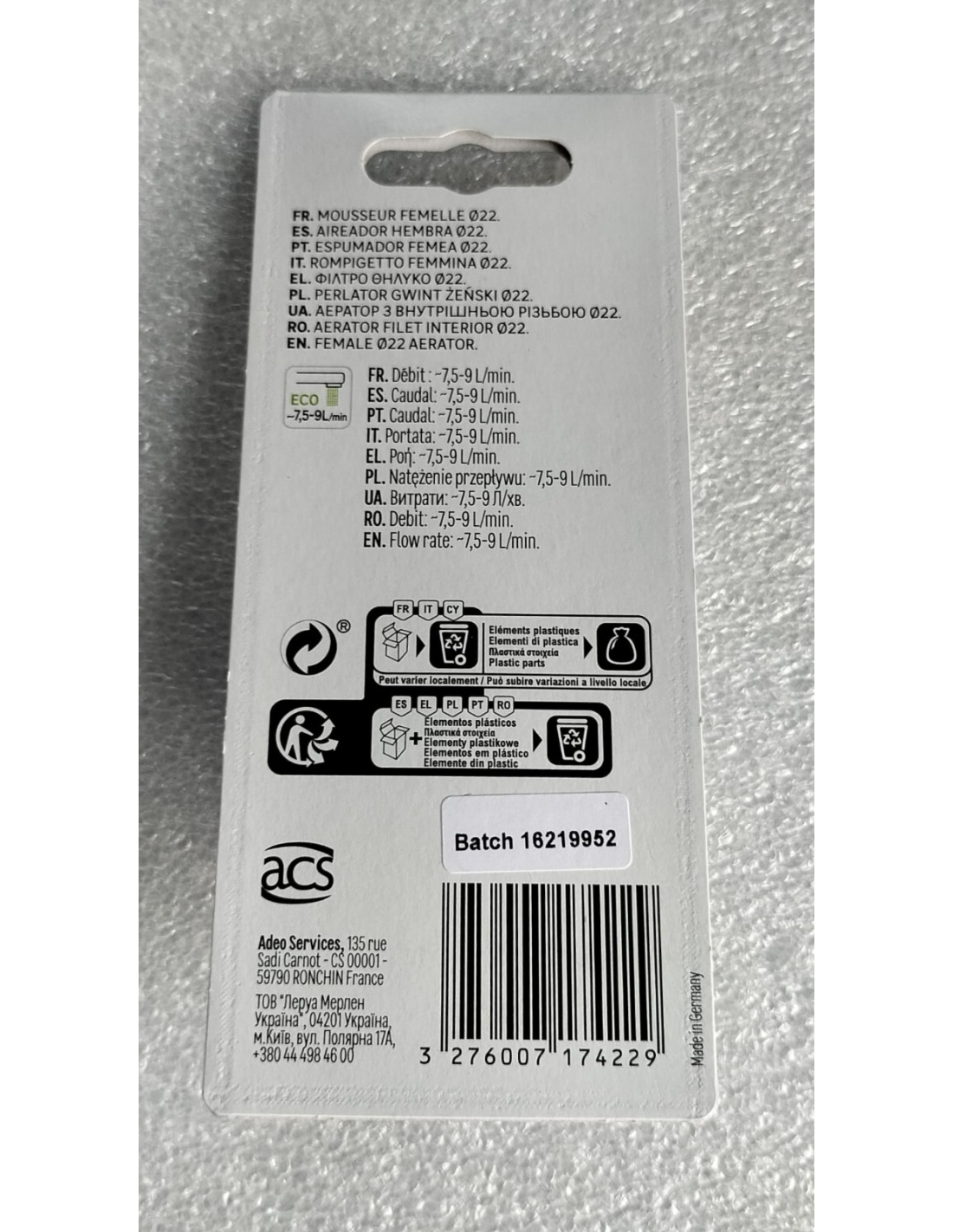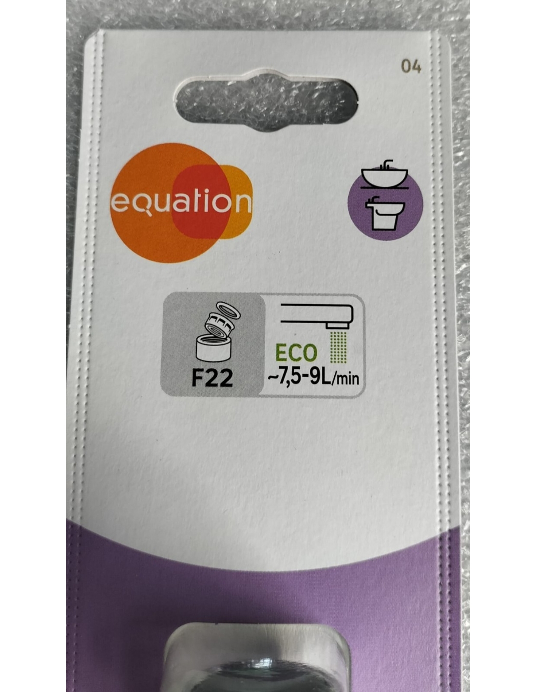 Trova il comfort di un nuovo rubinetto riducendo il consumo di acqua a circa 7,5-9 l/min. Questo kit (anello cromato femmina Ø22, aeratore e guarnizione inclusi) è pensato per essere collegato a un rubinetto per lavabo o bidet con filettatura femmina Ø22. Sarà facilmente assemblato e smontato utilizzando la chiave universale Equation disponibile separatamente.