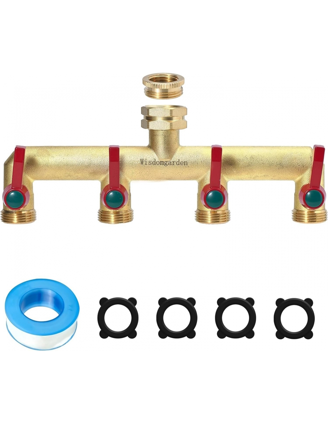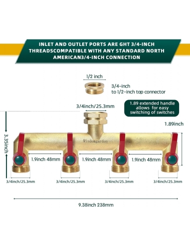 Wisdomgarden Splitter per Tubo da Giardino in Ottone Resistente, Splitter per Rubinetto a 4 Vie da 3/4"&1/2", Ingresso Acqua Esagonale aggiornato, più Robusto e duraturo, Lo Splitter per Rubinetto