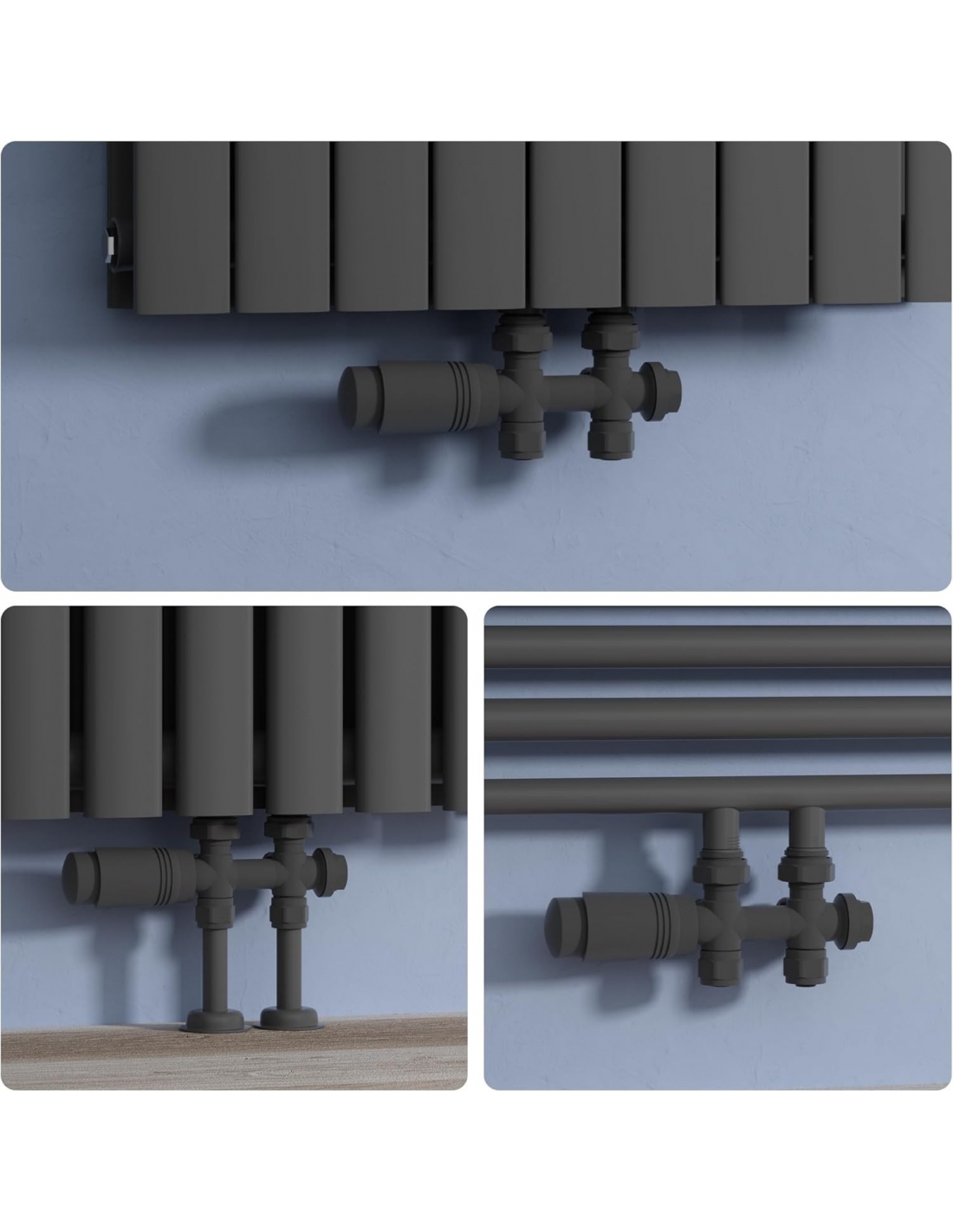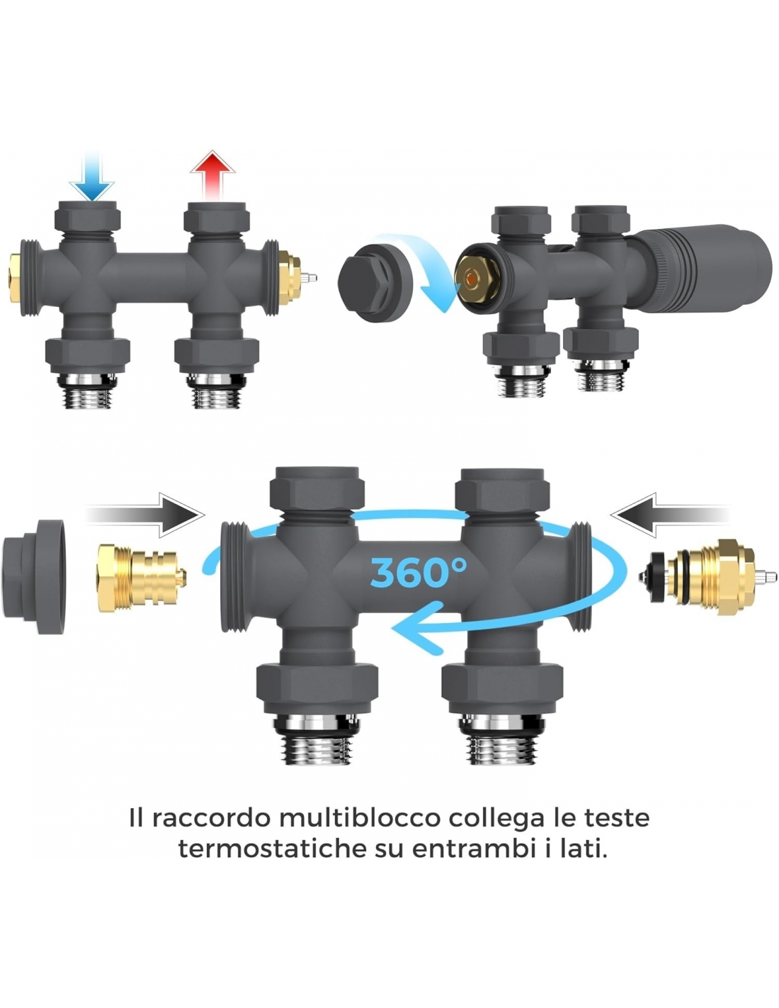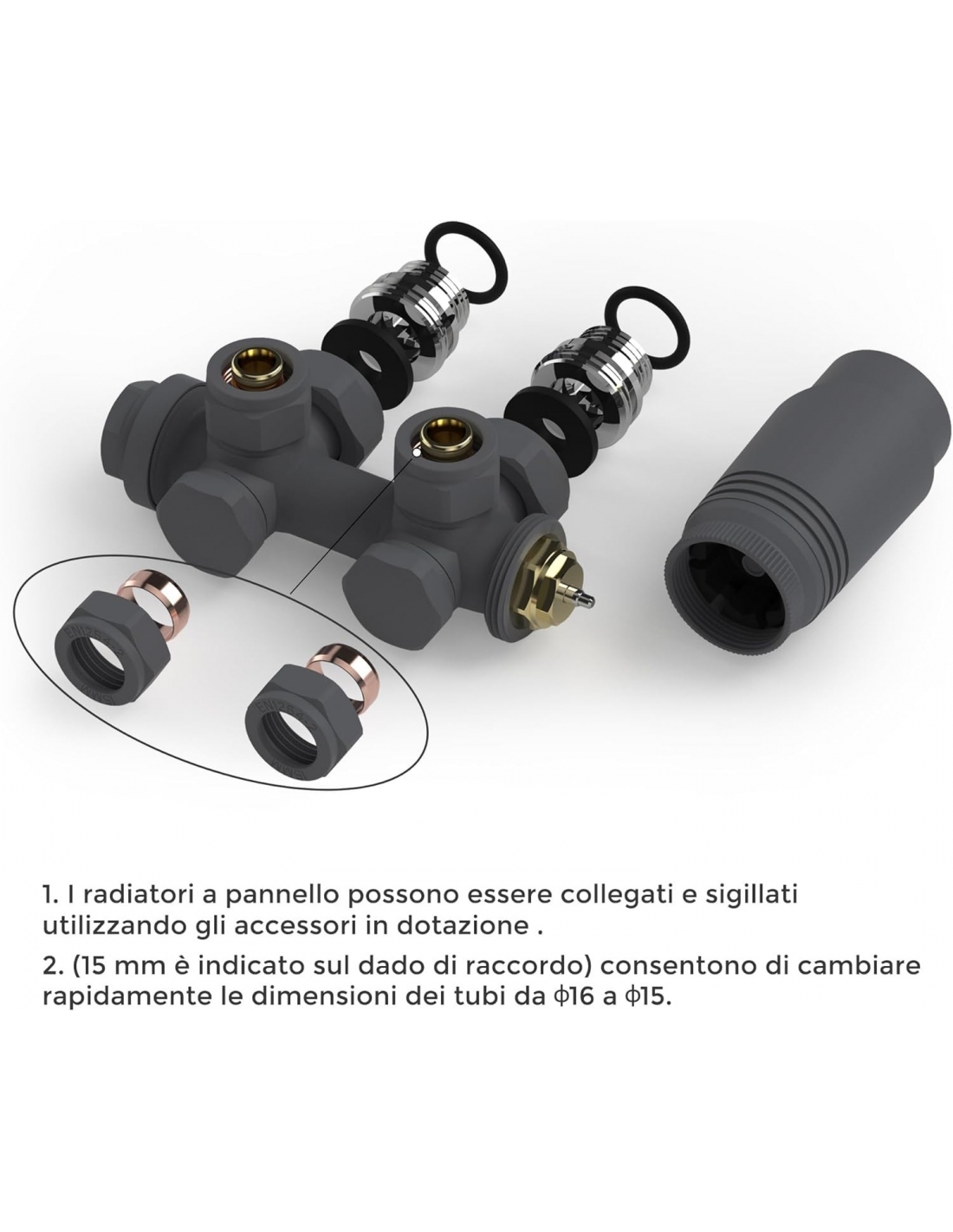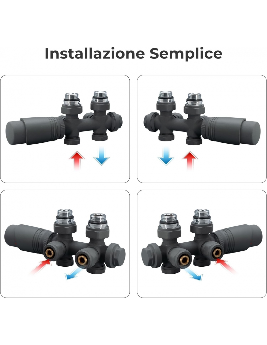 - Installazione: È una soluzione 2 in 1, trasformabile e senza attrezzi, che consente di utilizzarla in diverse configurazioni, sia che il tubo provenga dal pavimento che dalla parete. L'attacco M30x1,5 mm lo rende perfettamente compatibile con tutti i comuni radiatori e scaldasalviette con attacchi da 50 mm in qualsiasi spazio della casa, sia in orizzontale che in verticale.