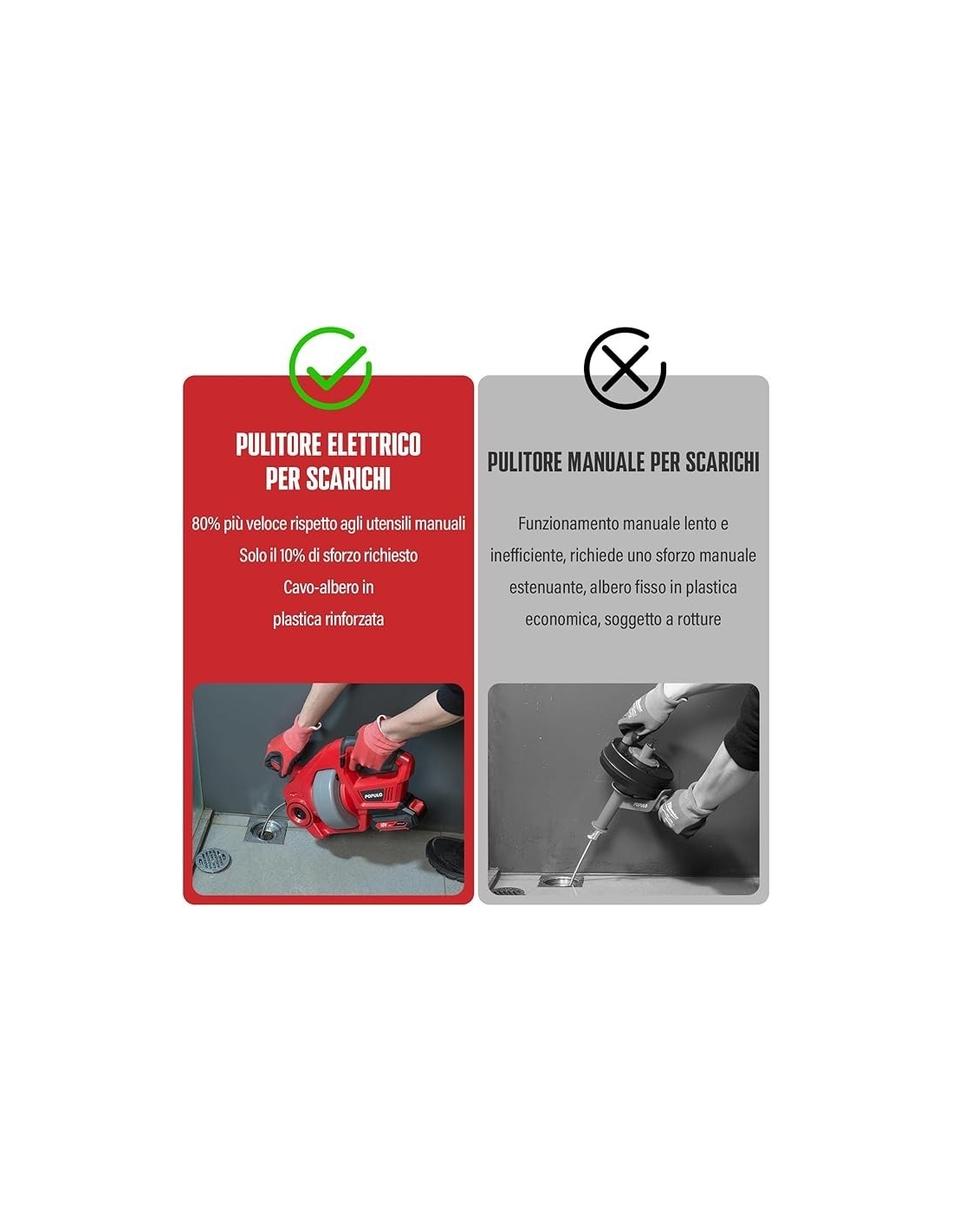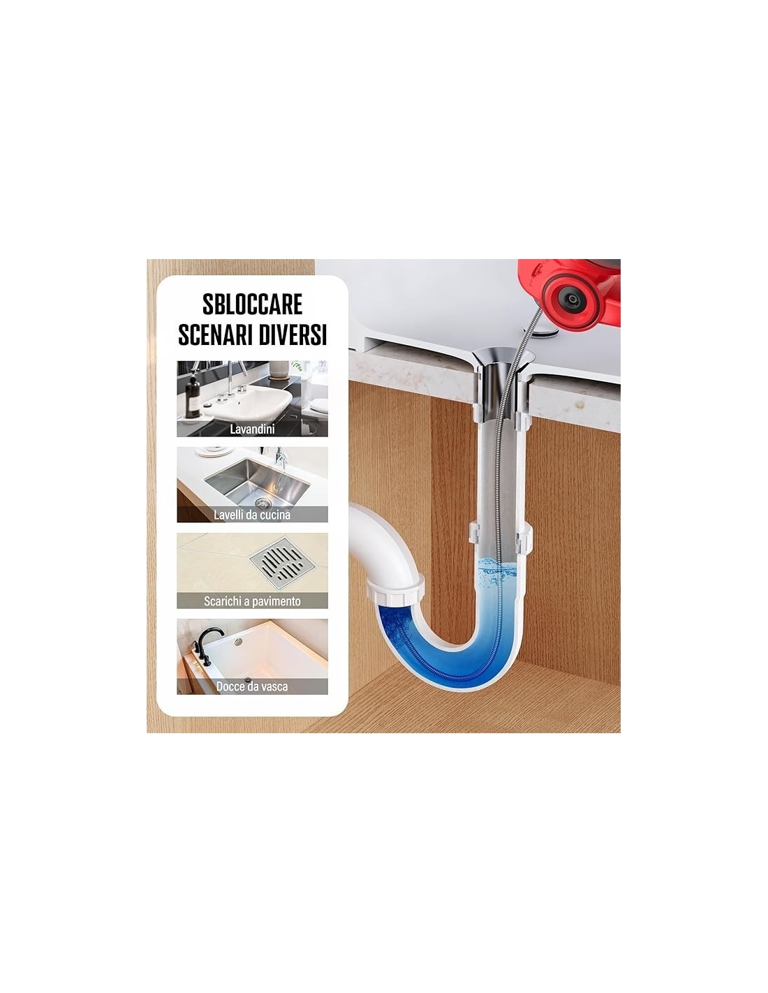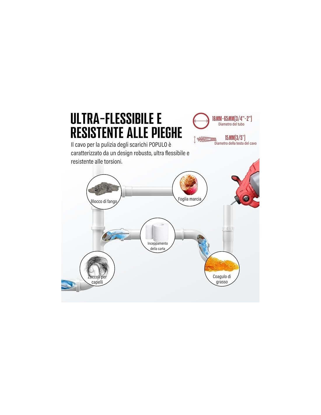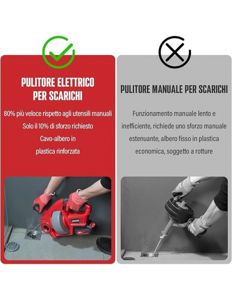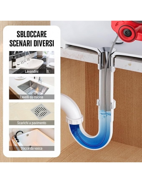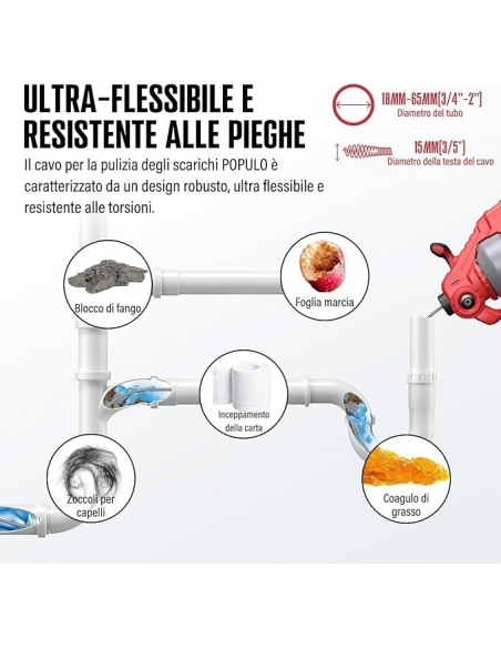 - 【Coclea per WC equipaggiata ALL-IN-ONE】 Cavo flessibile rinforzato da 25 piedi (7,5 mm) È modificabile! Elimina facilmente gli zoccoli dagli scarichi da ¾ fino a 2 pollici di larghezza inclusi lavandini, WC e vasche da bagno. Il meccanismo di alimentazione avanti e indietro alimentato fa sì che il cavo si svuoti o si scarichi automaticamente e l'impostazione del blocco del cavo mantiene il cavo in posizione mentre si affrontano gli zoccoli difficili.