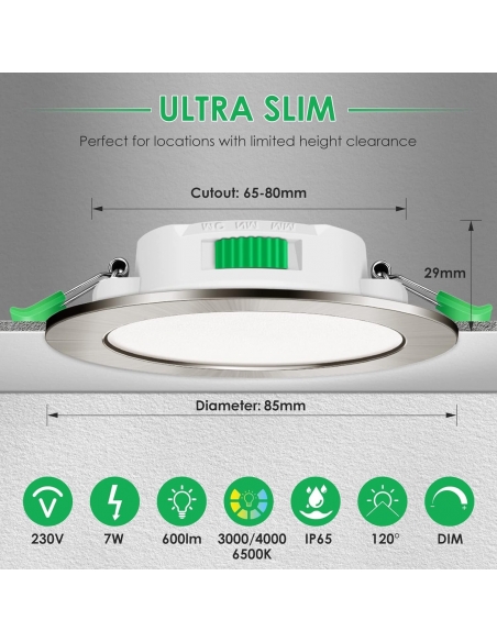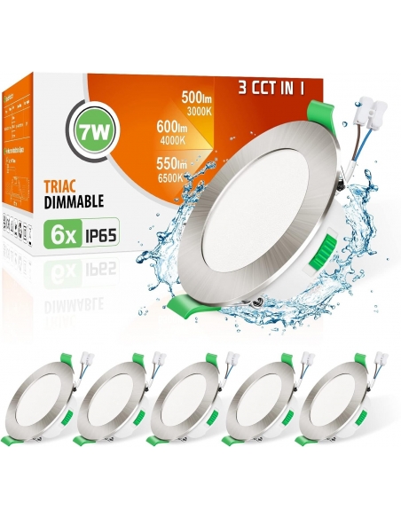 I faretti da bagno LED ALUSSO dimmerabili a soffitto da 7 W IP65 impermeabili hanno adottato un nuovo design, la temperatura del colore può essere impostata su 3000K (bianco caldo) o 4000K (bianco neutro) o 6500K (bianco freddo). Basta fare clic sull'interruttore a levetta verde sul lato del corpo della lampada e scegliere il colore più adatto alla tua casa, senza preoccuparti di acquistare la temperatura di colore sbagliata.