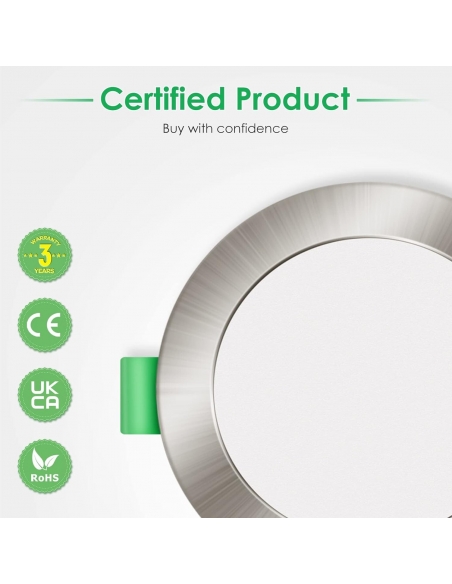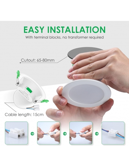 Downlgiht da incasso a LED ultrasottili ALUSSO con profondità di installazione di soli 29 mm, ideali per decorare soffitti con altezza limitata. Diametro Ø 85 mm, dimensioni foro soffitto Ø 65-80 mm, lunghezza cavo 15 cm, 6 morsettiere incluse. Collegati direttamente all'alimentazione da 230 V, non sono necessari altri trasformatori, i nostri downlight possono essere facilmente installati in pochi minuti anche se sei un principiante.