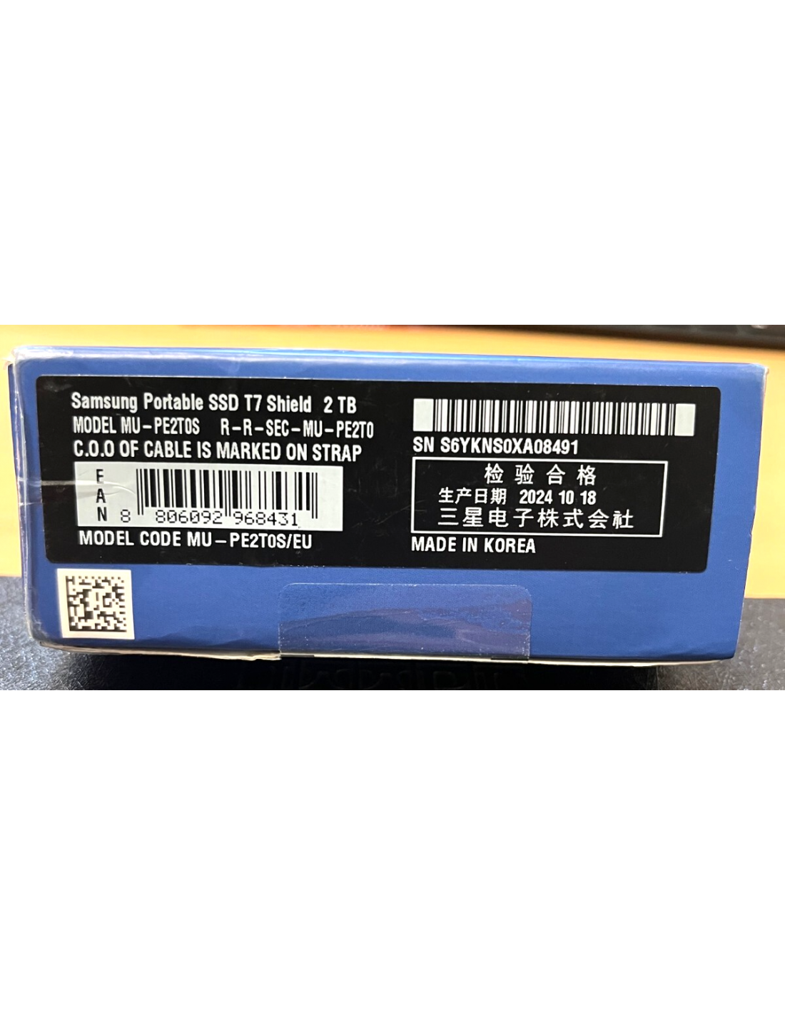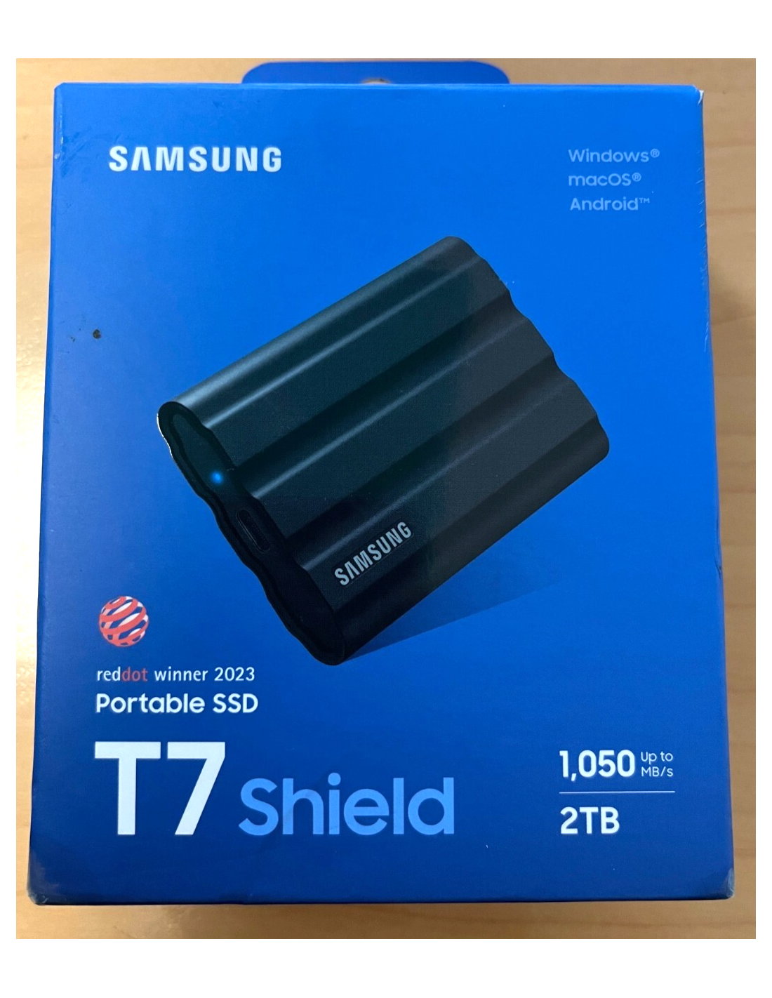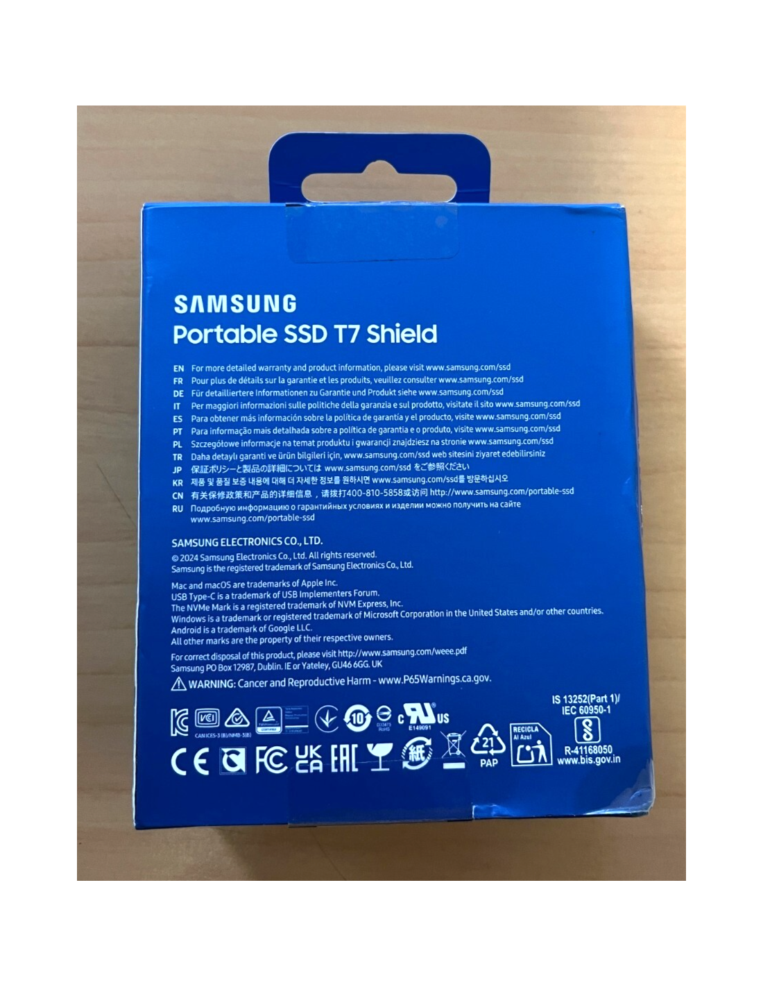 - Contenuto: 1x Samsung PSSD T7 Shield (MU-PE2T0S/EU) 2TB USB 3.2 Gen 2 (fino a 10 Gbps), retrocompatibile. Cavi inclusi nella confezione: USB tipo C-C, USB Tipo C-A.