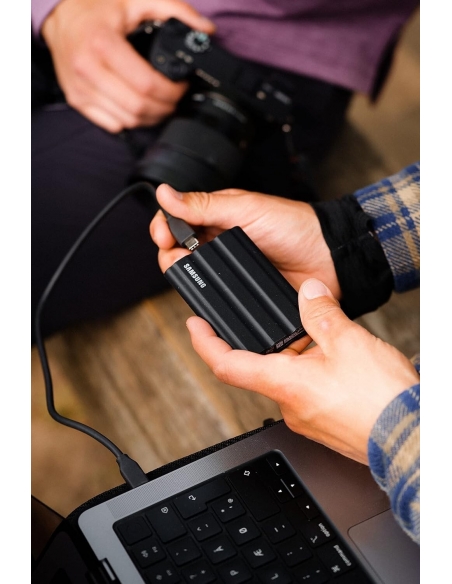 - SSD Portatile T7 Shield offre una velocità di lettura/scrittura sequenziali ultra-elevate fino a 1.050/1.000 MB/s per operazioni di editing istantaneo direttamente dal drive.