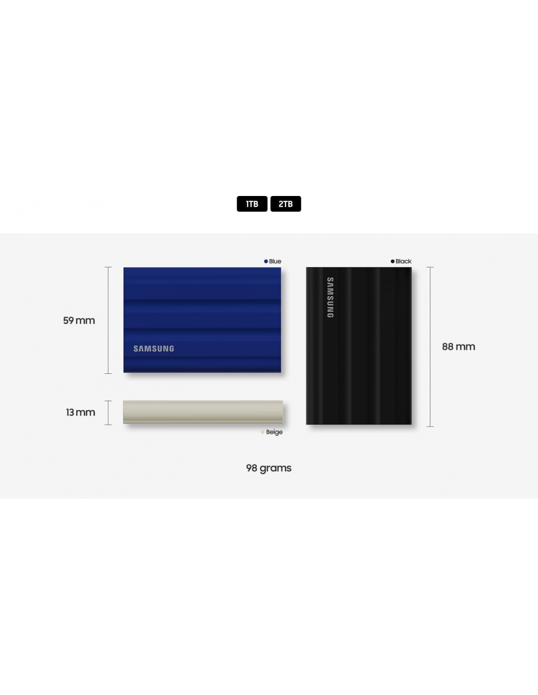 - Fino a 4 TB di spazio, il T7 Shield è datto ad ogni occasione, conservando i tuoi dati e contenuti al sicuro da acqua, polvere e cadute da un'altezza fino a 3 metri con la certificazione IP65.