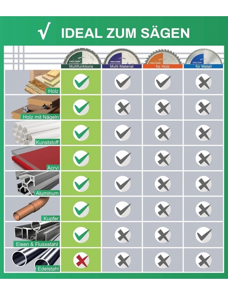 - Materiali e seghe utilizzabili: legno, legno con chiodi, acciaio, alluminio, acrilico, plastica, laminato e MDF da segare con troncatrice.