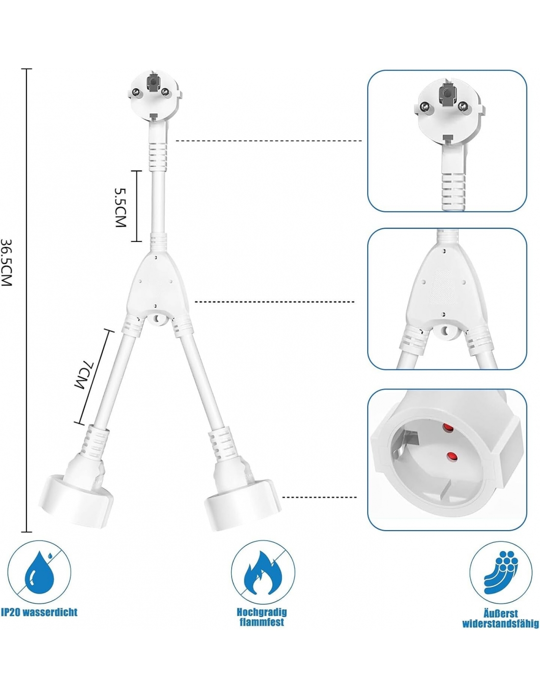 - La doppia spina per presa è realizzata con materiali ignifughi resistenti alle alte temperature e ignifughi, e ha una serratura per bambini integrata per prevenire efficacemente le scosse elettriche. Ha funzioni di protezione da sovratensione, sovracorrente, antistatica e cortocircuito.