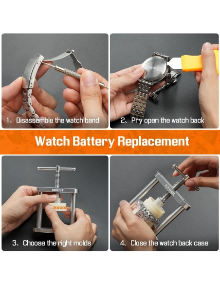 JOREST Kit Pressa Orologiaio Professionale, Attrezzi per Riparazione Orologi, Kit Cambio Batteria Orologio con Apri Cassa e Manuale di Istruzioni, Solo per Quadranti Rotondi
