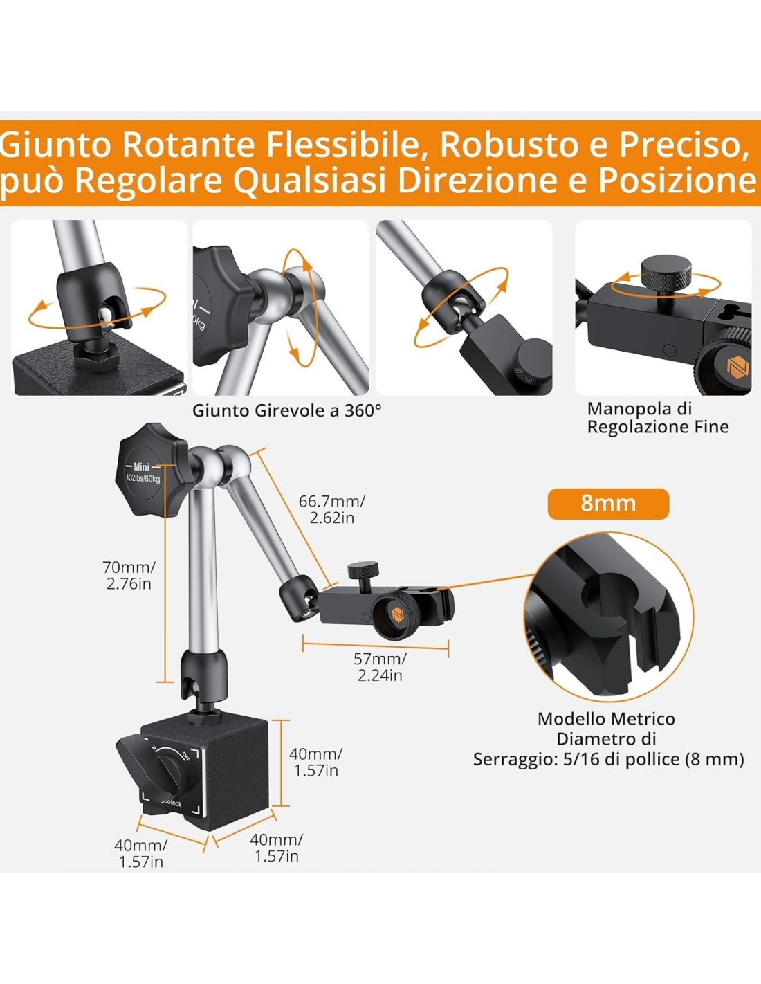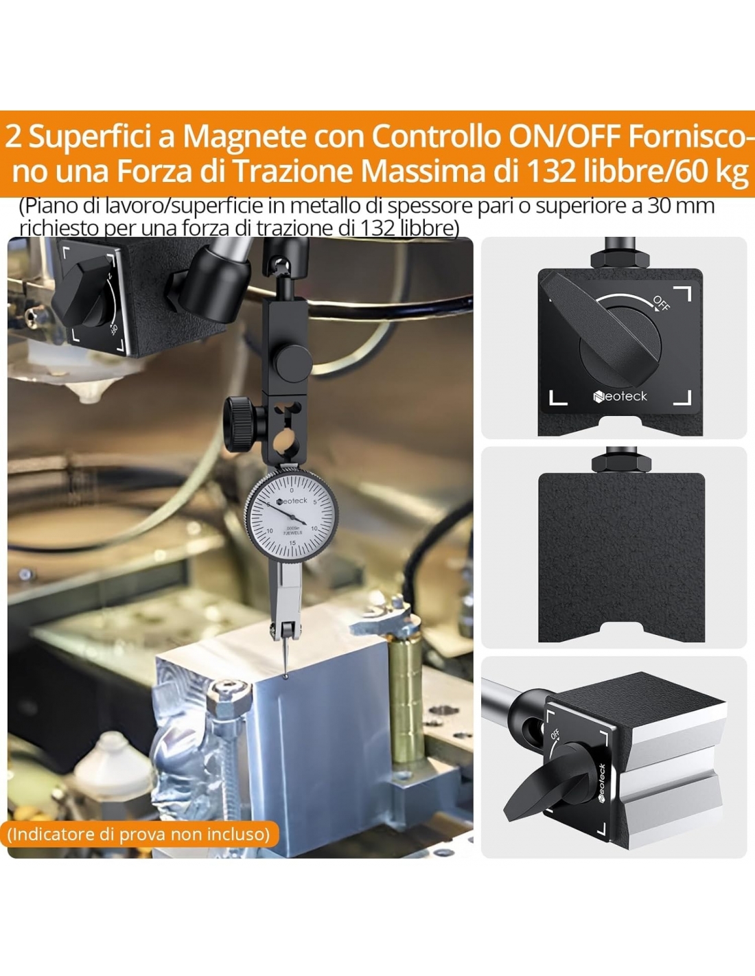 Neoteck Base Magnetica per Comparatore 132lbs/60 kg con 8mm Foro per Indicator Magnetico Base Supporto Del Basamento 3 Braccio Regolabili con ON/OFF Interruttore per Indicatore di Comparatore