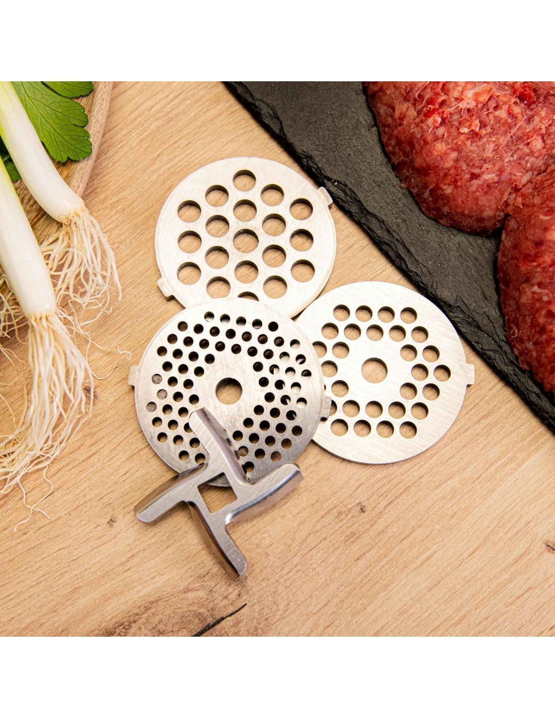 - Trita gli alimenti più duri: grazie alle sue 3 piastre di taglio con fori da 3 mm, 5 mm e 7 mm e 1 lama in acciaio inossidabile che mantiene l'affilatura più a lungo