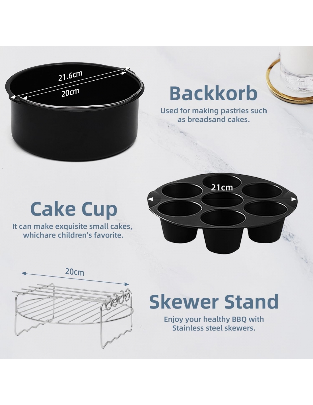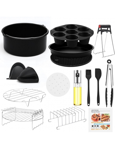 - 【AMPIA COMPATIBILE】Questo set di accessori friggitrice ad aria ha un diametro di 22 cm ed è adatto per friggitrici ad aria di oltre 23 cm, Applicabile a COSORI 6,2 L, Philips 6,5 L e altre marche e modelli di friggitrici ad aria. Può essere utilizzato anche nei forni, nei forni a microonde e nelle pentole a pressione. Prima di acquistare, misurate le dimensioni della vostra friggitrice ad aria per assicurarvi che gli accessori siano compatibili
