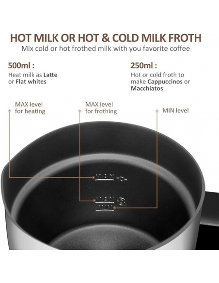 - Versatile montalatte automatico: il montalatte KYG è adatto a tutti i tipi di latte. Monta latte freddo e caldo e riscalda il latte. Schiuma di latte calda adatta per cappuccino o latte macchiato, schiuma di latte fredda adatta per frappè e dessert, latte caldo adatto per caffè o cacao. Capacità per schiuma di latte da 80 a 115 ml e latte caldo da 80 a 240 ml.