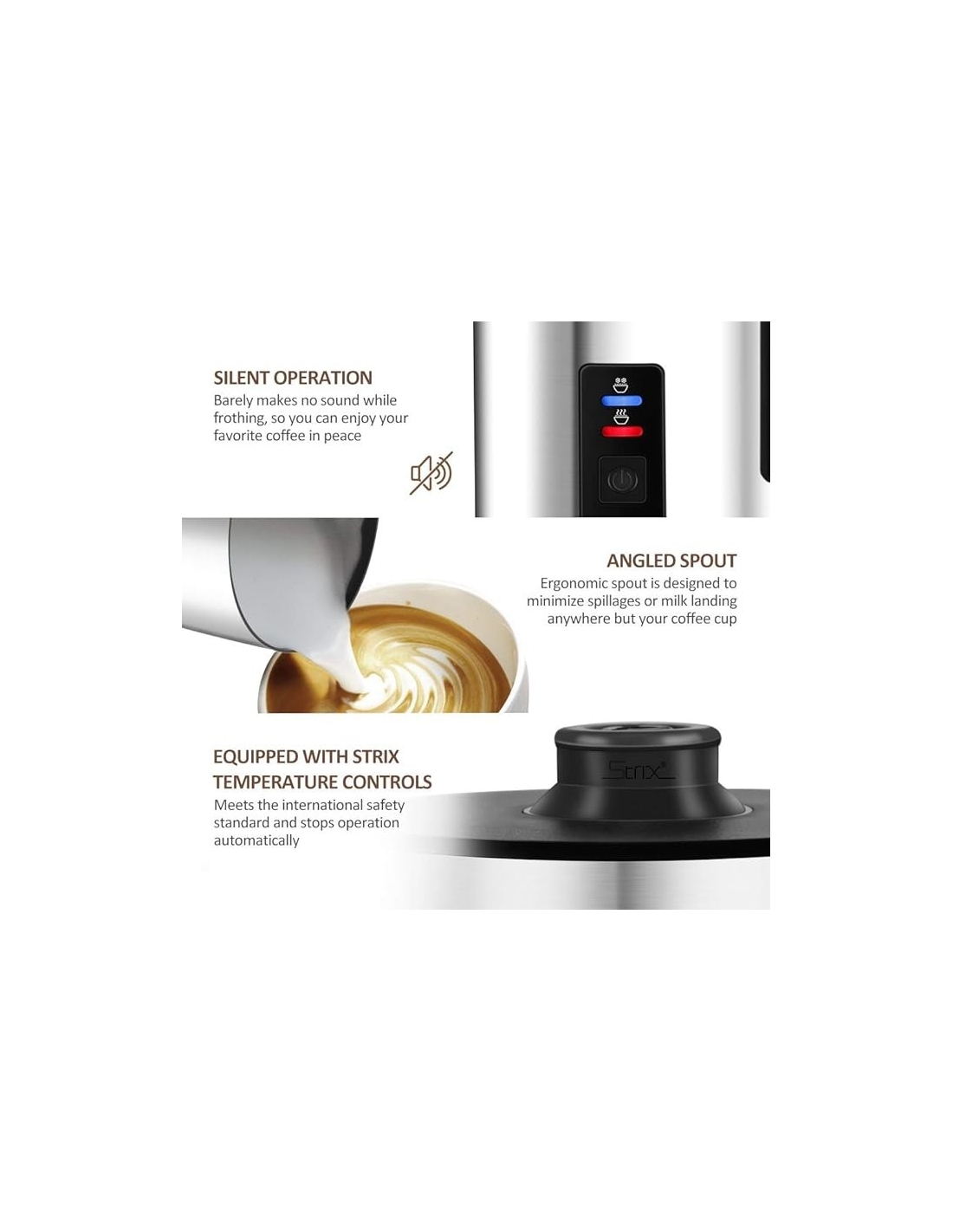 - Per piccoli e grandi intenditori: il montalatte con accessori rimovibili è il dispositivo perfetto per preparare comodamente schiuma di latte, latte caldo o bevande a base di latte. Pulsante illuminato a LED con azionamento a un solo pulsante. I controlli della temperatura Strix soddisfano gli standard di sicurezza internazionali, spegnimento automatico con protezione da surriscaldamento.