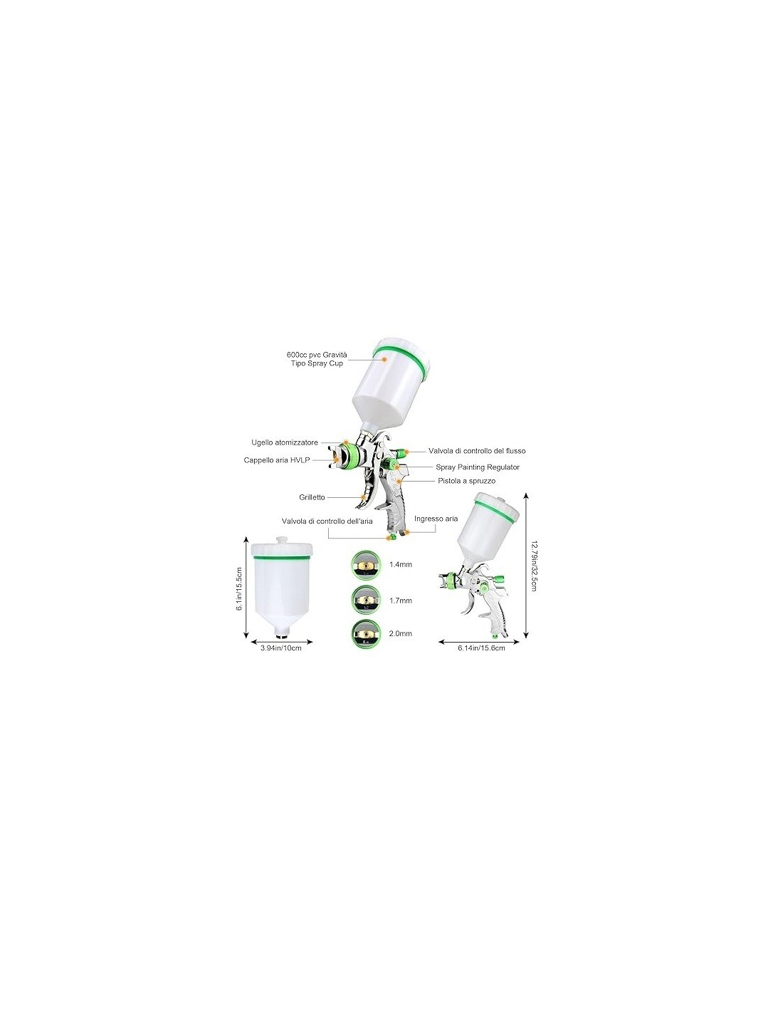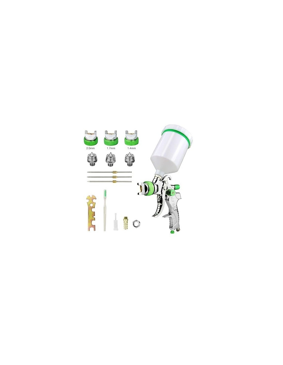 Pistola a spruzzo ad alta atomizzazione: la pistola a spruzzo HVLP utilizza la tecnologia HVLP e un attacco per aria compressa, un corpo in lega, un contenitore per vernice da 600 ml, 3 ugelli in acciaio inossidabile: 1,4 mm, 1,7 mm, 2,0 mm, 1 pistola, 1 pennello, 1 chiave inglese e 1 manuale utente per pistola a spruzzo industriale. Garantisce un'atomizzazione fine, risparmiando tempo e materiali e ottenendo un effetto di spruzzatura uniforme e dettagliato.