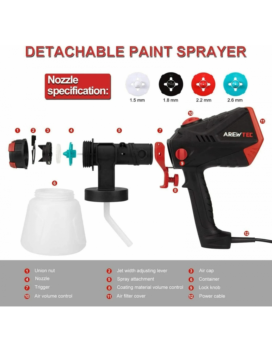 - Componenti incluse: 1 * Pistola per spruzzatore vernice AREWTEC 600W 1 * Imbuto 1 * ago per la pulizia 1 * Pennello per la pulizia 1 x manuale utente 4 * Ugelli a spruzzo 1.5 / 1.8 / 2.2 / 2.6mm (ugelli 2.6mm già installati sulla pistola a spruzzo)