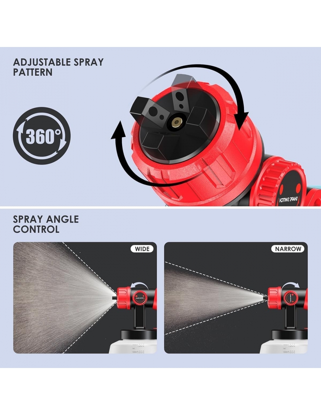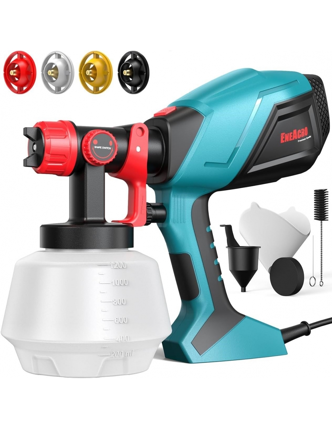 ENEACRO JH12 HVLP Pistola a Spruzzo Elettrica 700W con Contenitore da 1200ml, Flusso e Angolo di Spruzzatura Regolabili, 4 Ugelli in Ottone e Motivo di Spruzzo Girevole a 360° per Interni ed Esterni Casa