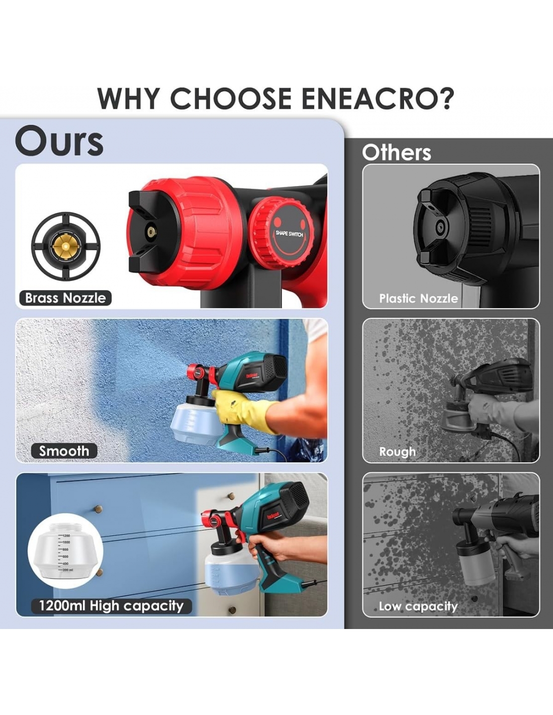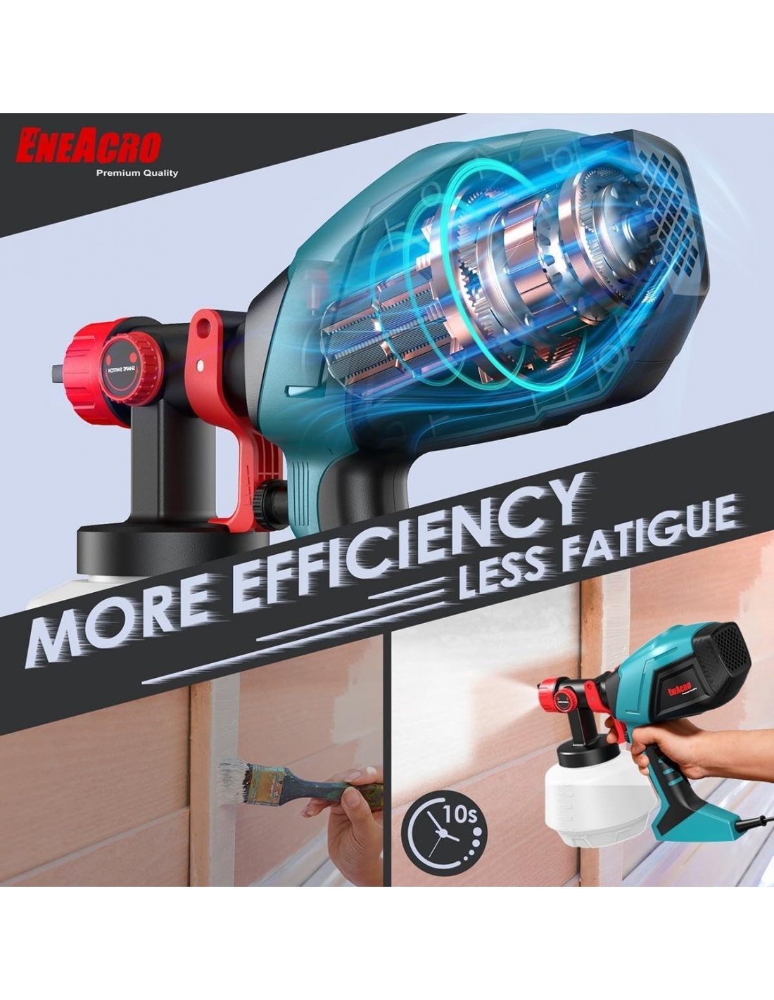 - 【700W Potente spruzzatore HVLP】 Lo spruzzatore ENEACRO HVLP è dotato di un motore in rame da 700W e di un grande contenitore da 1200 ml. La viscosità massima è stata portata a 70 Din-s e l'effetto di spruzzatura è stato notevolmente migliorato, in modo da ottenere una finitura liscia e superiore. Rispetto alle tradizionali vernici a pennello e a rullo, può aiutare notevolmente a risparmiare tempo ed energia per la verniciatura di porte in legno e metallo, ponti, recinzioni, soffitti, mobili, pareti, armadietti, pavimenti, porte di garage, ecc.