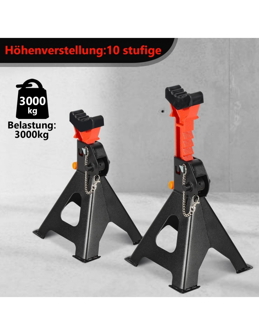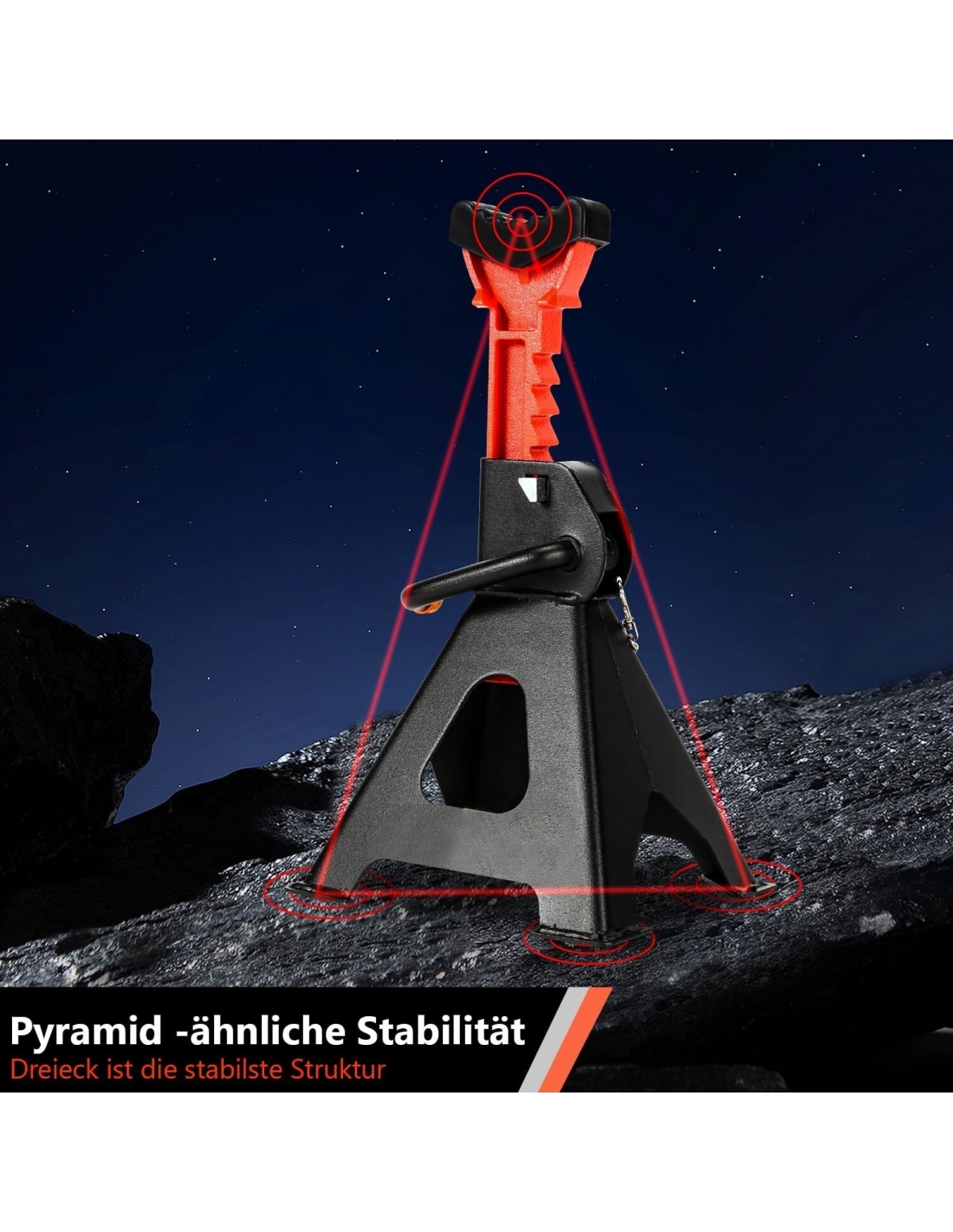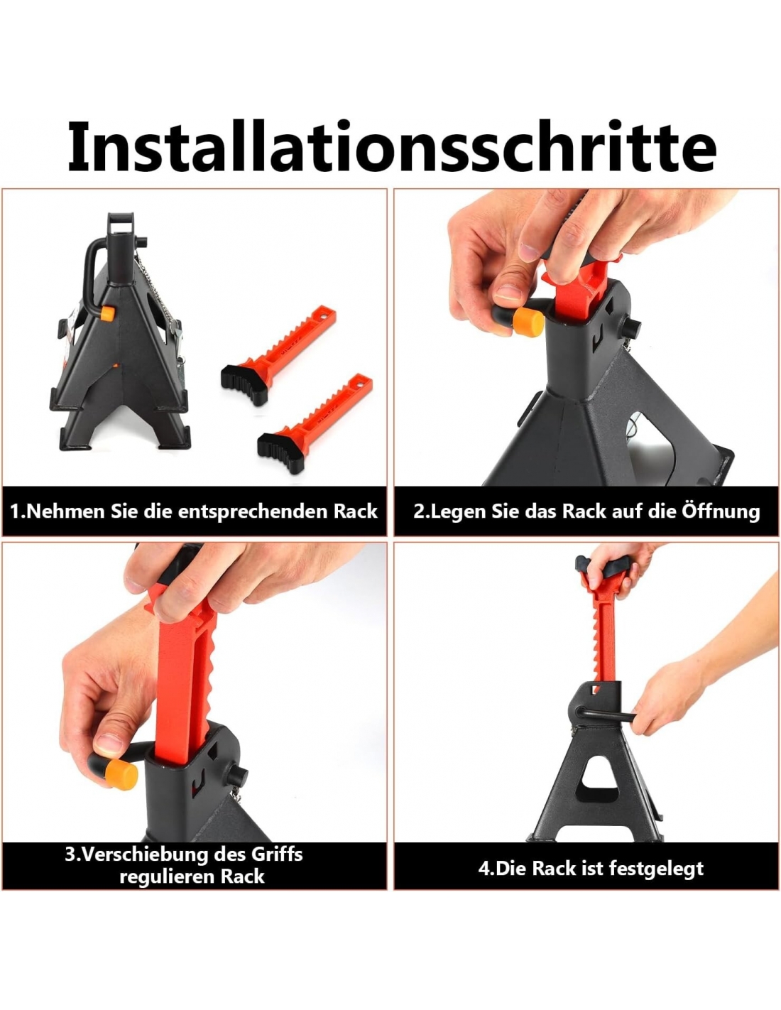 - Robusto telaio in acciaio con rivestimento antiruggine: il cavalletto è realizzato in acciaio di alta qualità ed è dotato di un rivestimento antiruggine. Peso per cavalletto: circa 2,6 kg, dimensioni 19 x 20,5 x 43 cm (lunghezza x larghezza x altezza). Portata 3T per cavalletto.
