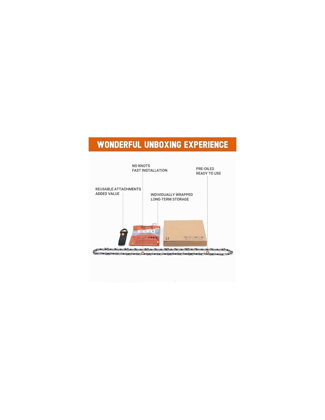 - 【Catena a basso rimbalzo】: ogni catena della sega viene fornita olio protettivo sulla superficie, resiste all'usura e migliora la forza, riducendo i cambiamenti di tensione della catena e consente alla macchina di funzionare più agevolmente.