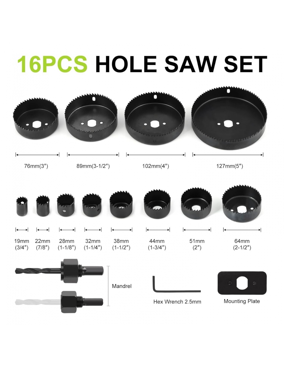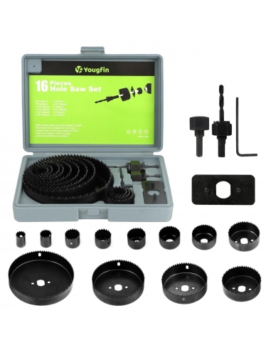 Kit di seghe circolari, set di seghe a tazza da 16 pezzi con 12 lame, 2 mandrini, piastra di installazione e chiave esagonale - Ideale per legno tenero, compensato, cartongesso, PVC - Dimensioni 3/4"-5" (19-127 mm)
