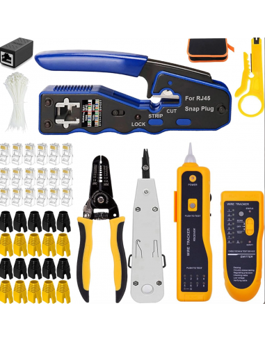 Il kit di strumenti di crimpatura RJ45 include: 20 connettori Cat5e, 20 stivali antistrappo per cavi, tester per cavi di fascia alta e mini coltello spelafili, strumento di perforazione, fascette per cavi e cavo diretto.