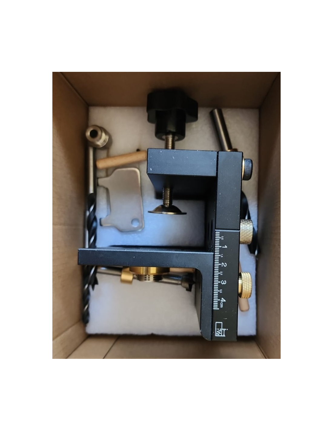 - Design unico: la scala metrica è chiara e può essere installata su un desktop. Il dispositivo obliquo viene lavorato mediante lavorazione CNC ad alta precisione per garantire una stampatura accurata e affidabile. Il kit di guide di perforazione finemente lavorato è progettato con una scala di precisione sul corpo principale, e la scala può essere regolata in base allo spessore della scheda