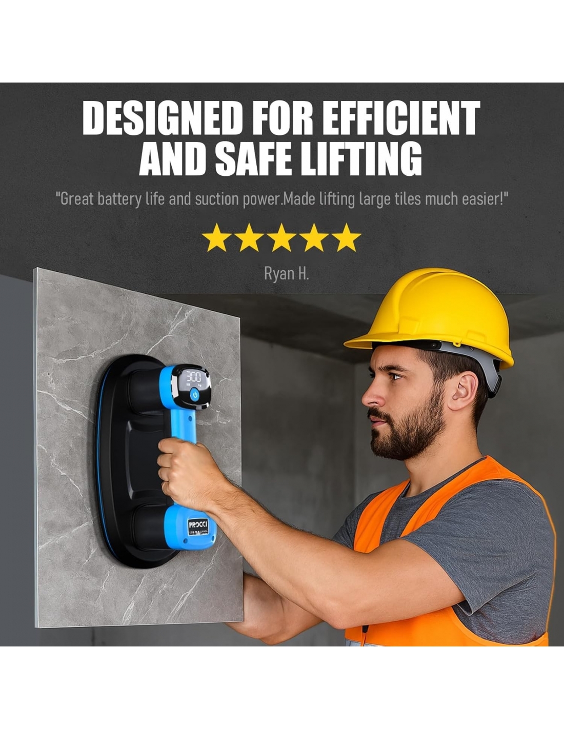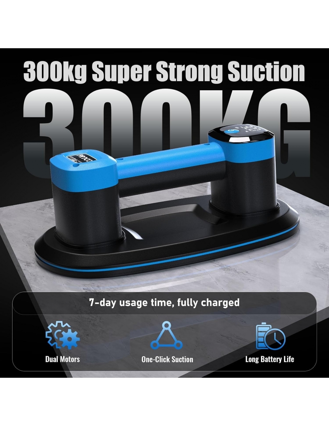 - POTENTE: Sistema a doppio motore con 300 KG di forza di aspirazione per sollevare in sicurezza piastrelle, vetro e lastre di marmo pesanti.