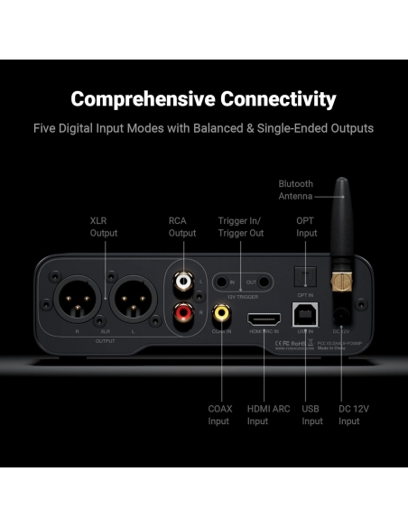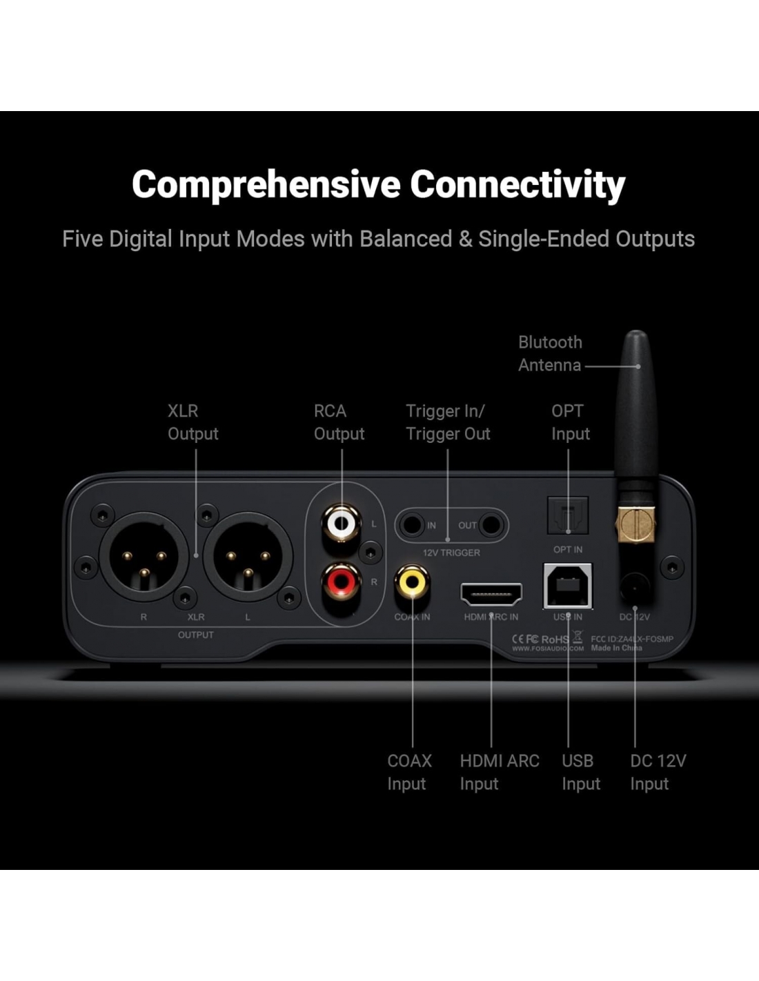 - DAC da Tavolo di Punta: Un preamplificatore con convertitore digitale-analogico completamente bilanciato con ingressi e uscite multiple. È il primo DAC di Fosi Audio a supportare l'ingresso HDMI ARC ed è dotato di un chip ES9039Q2M ad alte prestazioni per offrire un suono ricco e superiore.