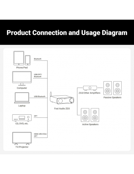 - Versatile e Flessibile: Lo ZD3 offre una connettività completa, supportando ingressi come Bluetooth, USB, OPT, COAX, HDMI ARC e uscite bilanciate XLR/RCA. Questa flessibilità consente di personalizzare il sistema audio per adattarlo a diverse configurazioni e scenari.