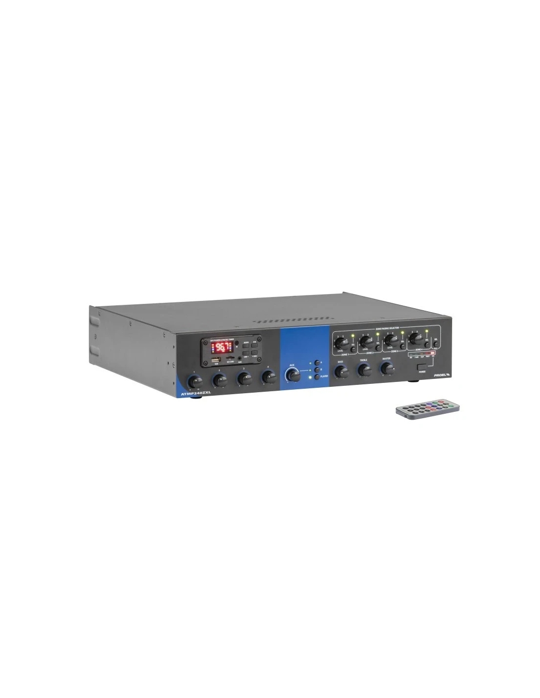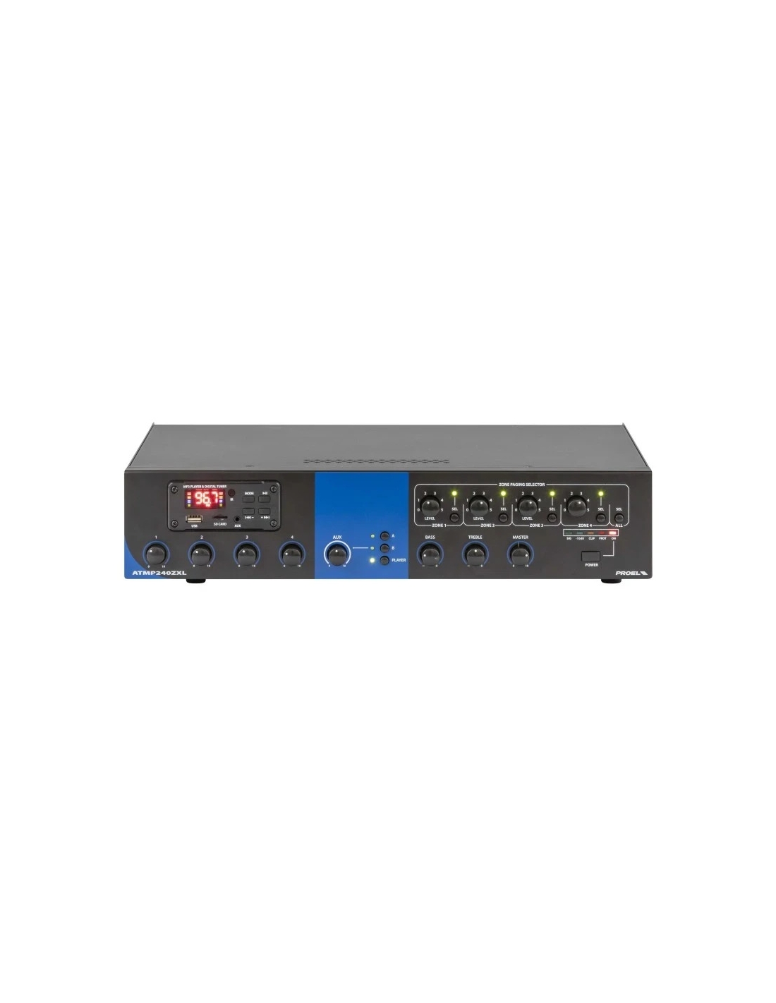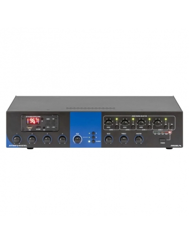 ATMP240ZXL è un mixer-amplificatore professionale in grado di erogare fino a 240W su 4 zone, completo di modulo multimediale con radio FM, lettore MP3 su supporto SD/USB e connessione Bluetooth. Questo nuovo mixer amplificatore è stato progettato per soddisfare le esigenze di un mercato in continua evoluzione nel modo più flessibile e professionale, rispondendo a precisi criteri operativi, ed è costruito e testato per garantire assoluta affidabilità all'utente, anche con funzionamento continuo. Abbinando fino a 4 basi microfoniche RM4 all'ATMP240ZXL, è possibile realizzare un sistema con chiamata su singola zona, su gruppi di zone o in generale su tutte le zone. Inoltre, sfruttando le uscite di linea, è possibile abbinarlo ad amplificatori booster per creare un sistema a 4 zone di potenza anche superiore.