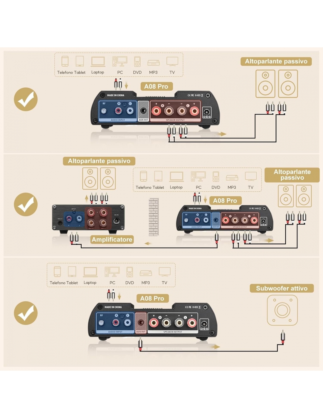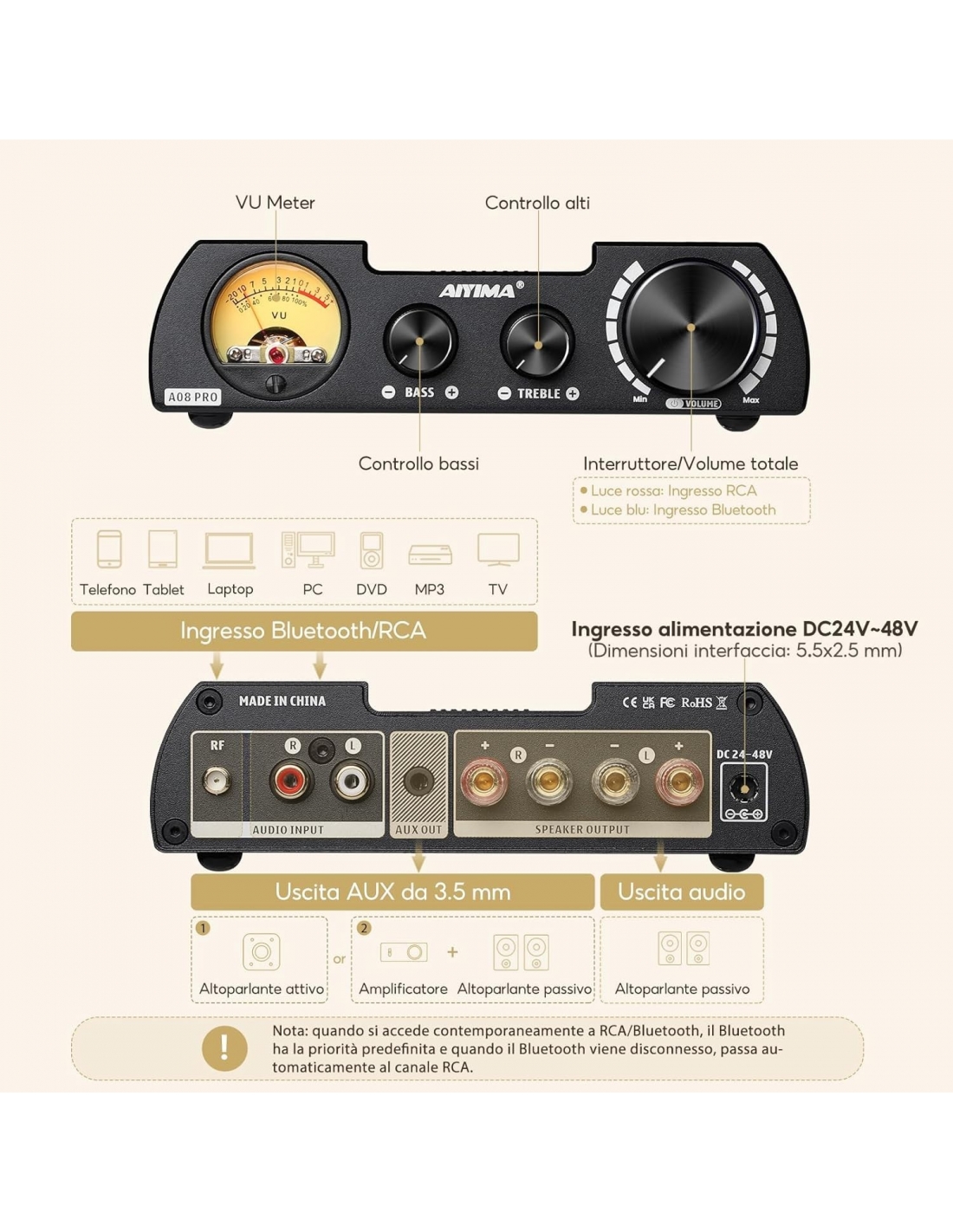 - Due modalità di ingresso/uscita: supporta l'ingresso RCA/Bluetooth, compatibile con una varietà di dispositivi di riproduzione multimediale, come: telefoni cellulari, tablet, computer, MP3, TV, ecc. altoparlanti, subwoofer attivi, amplificatori di potenza, ecc.