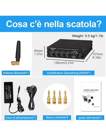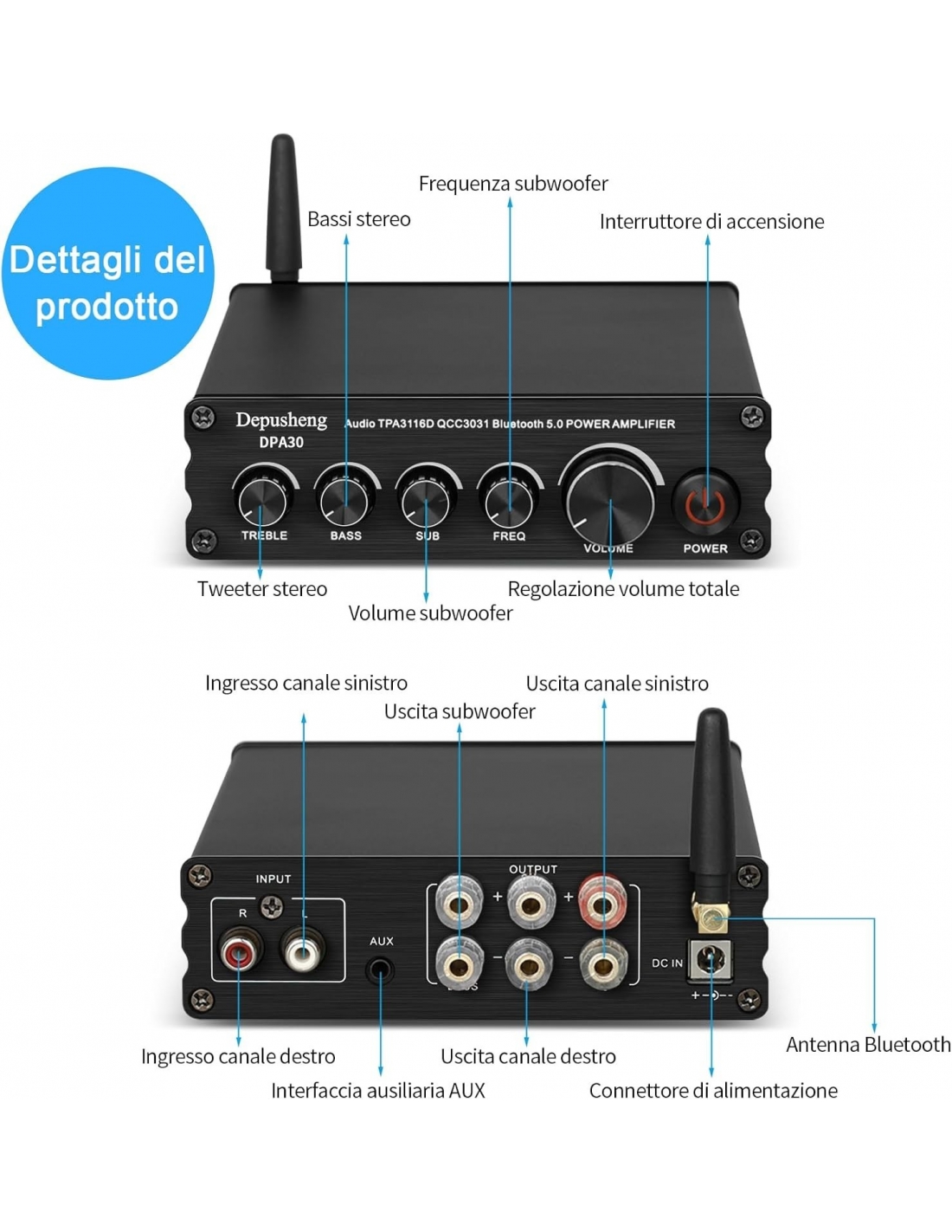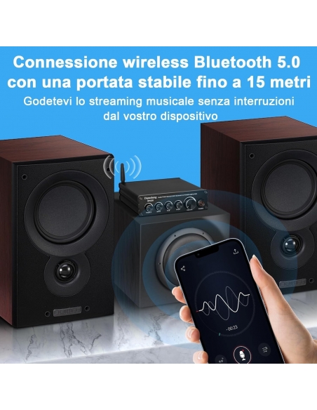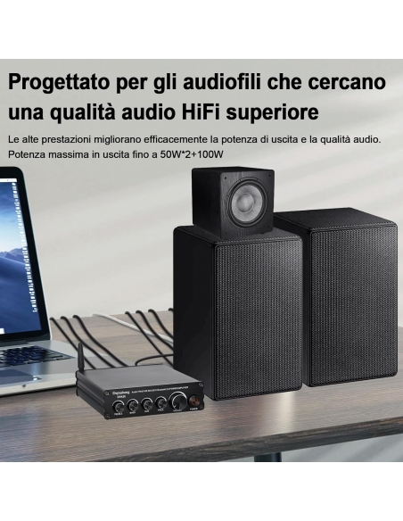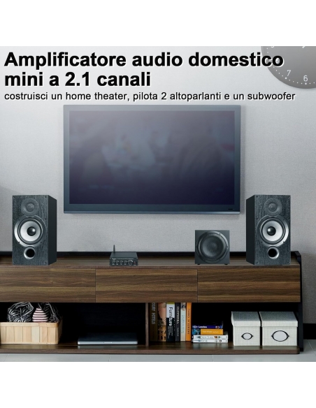 - Amplificatore di potenza HiFi a 2.1 canali: può pilotare la maggior parte degli altoparlanti passivi domestici e subwoofer passivi. Potenza massima in uscita fino a 200 watt. (Compatibile solo con altoparlanti passivi)