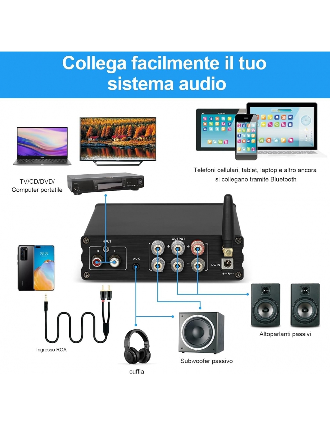 - Amplificatore di potenza con ingresso RCA e Bluetooth wireless 5.0: la portata di ricezione Bluetooth wireless è fino a 50 piedi ed è compatibile con i dispositivi più recenti come smartphone, tablet, laptop, computer, ecc.