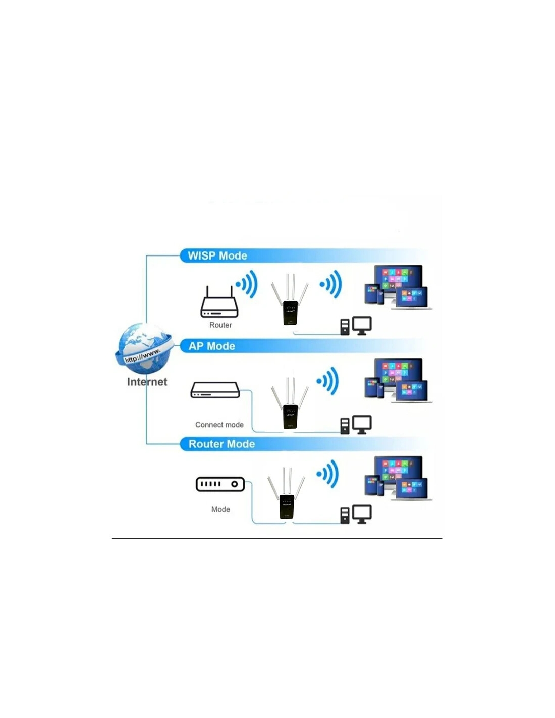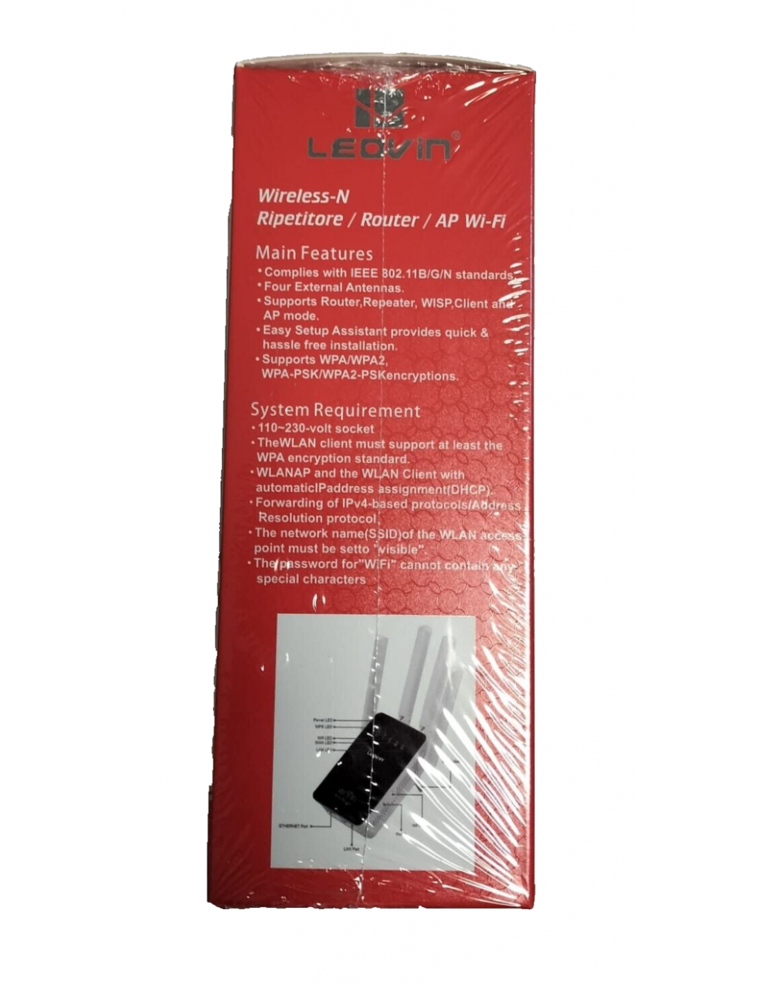 Compatibile con IEEE 802.11 b/g/n standard 4 antenne. •Supporto ripetitore Ripetitore AP, WISP. •LED: Alimentazione, WPS, WAN, LAN, WLAN. •Ingresso: AC 100 ~ 240V, 50 / 60Hz Uscita: 5V / 1A. •Velocità del segnale: 2,4 GHz, 300Mbps. •Potenza di trasmissione: inferiore a 20dBm(EIRP). •Sicurezza wireless: Supporto 64/128 bit WEP, WPA-PSK/WPA2-PSK, 802.1. •Dimensioni: 17x6x3 cm circa.