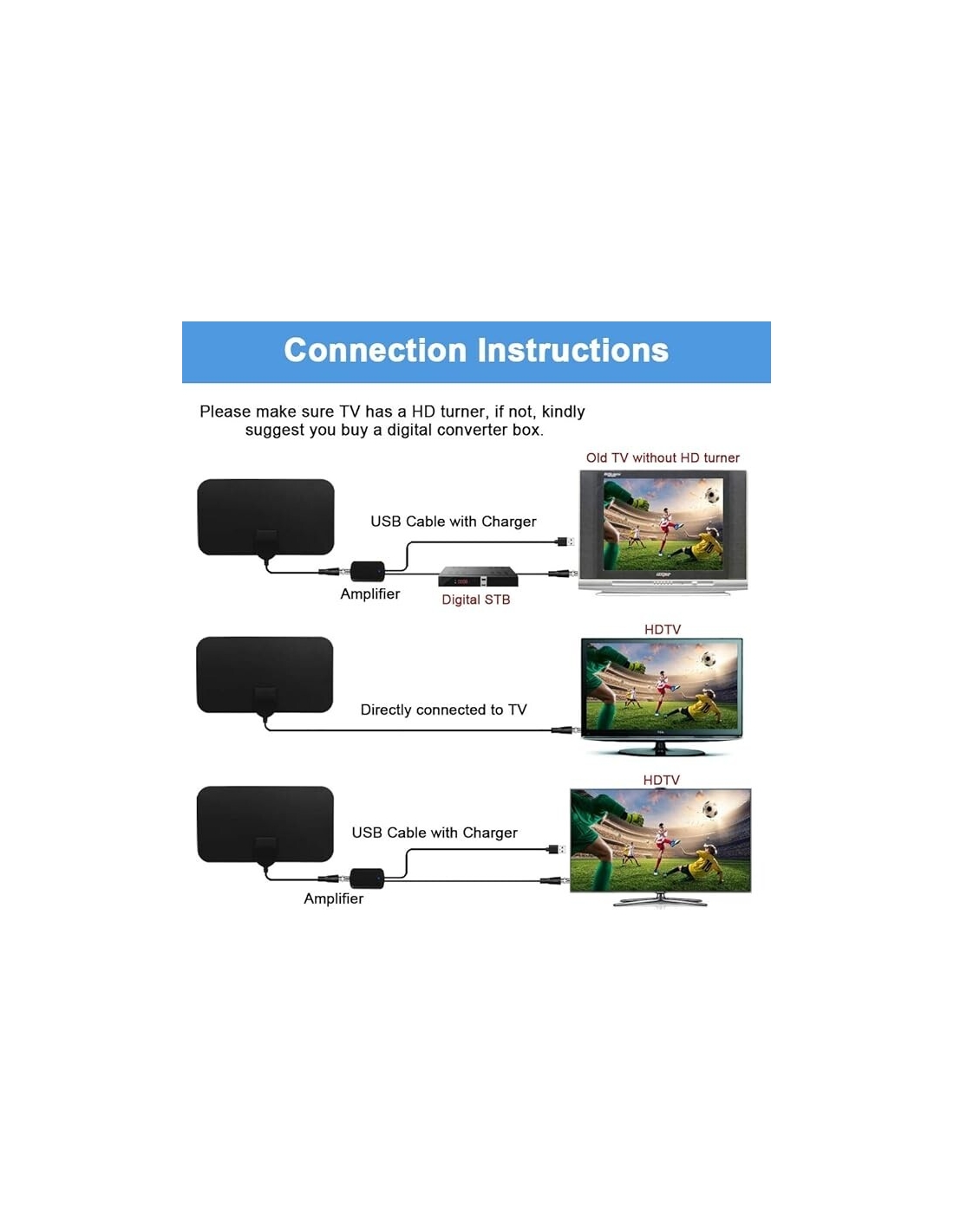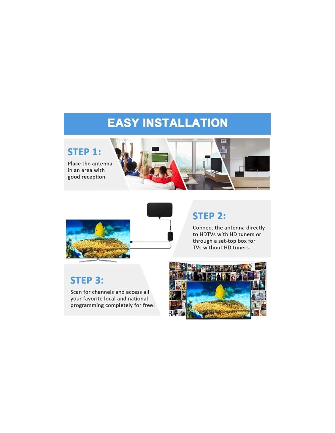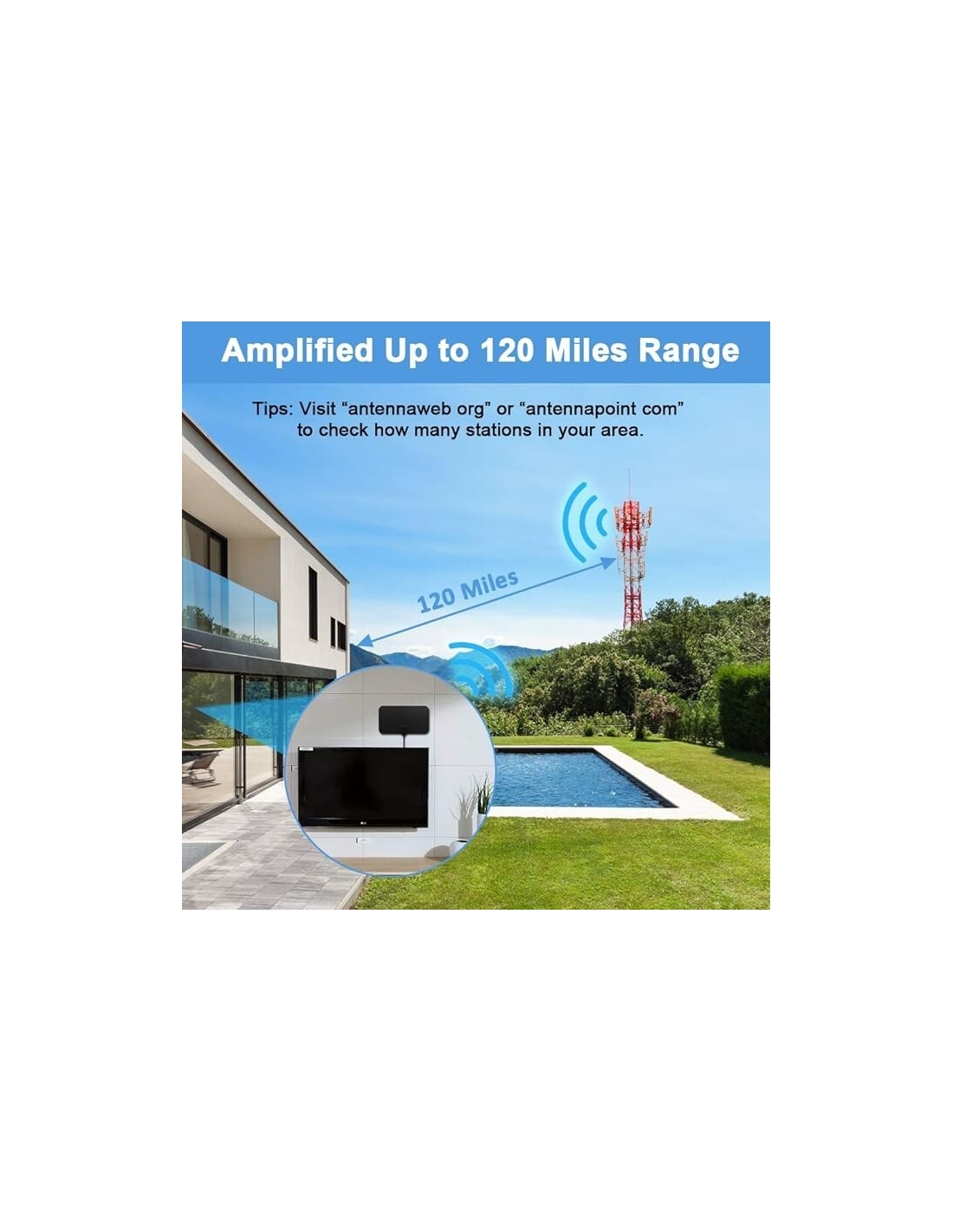 L'antenna digitale HDTV può raggiungere una portata fino a 120 km al secondo della regione e può essere posizionata quasi ovunque nella casa. L'antenna TV digitale HD cerca costantemente nuovi canali non appena disponibili per la trasmissione. Prima dell'acquisto, tieni presente i canali disponibili nella tua regione.
