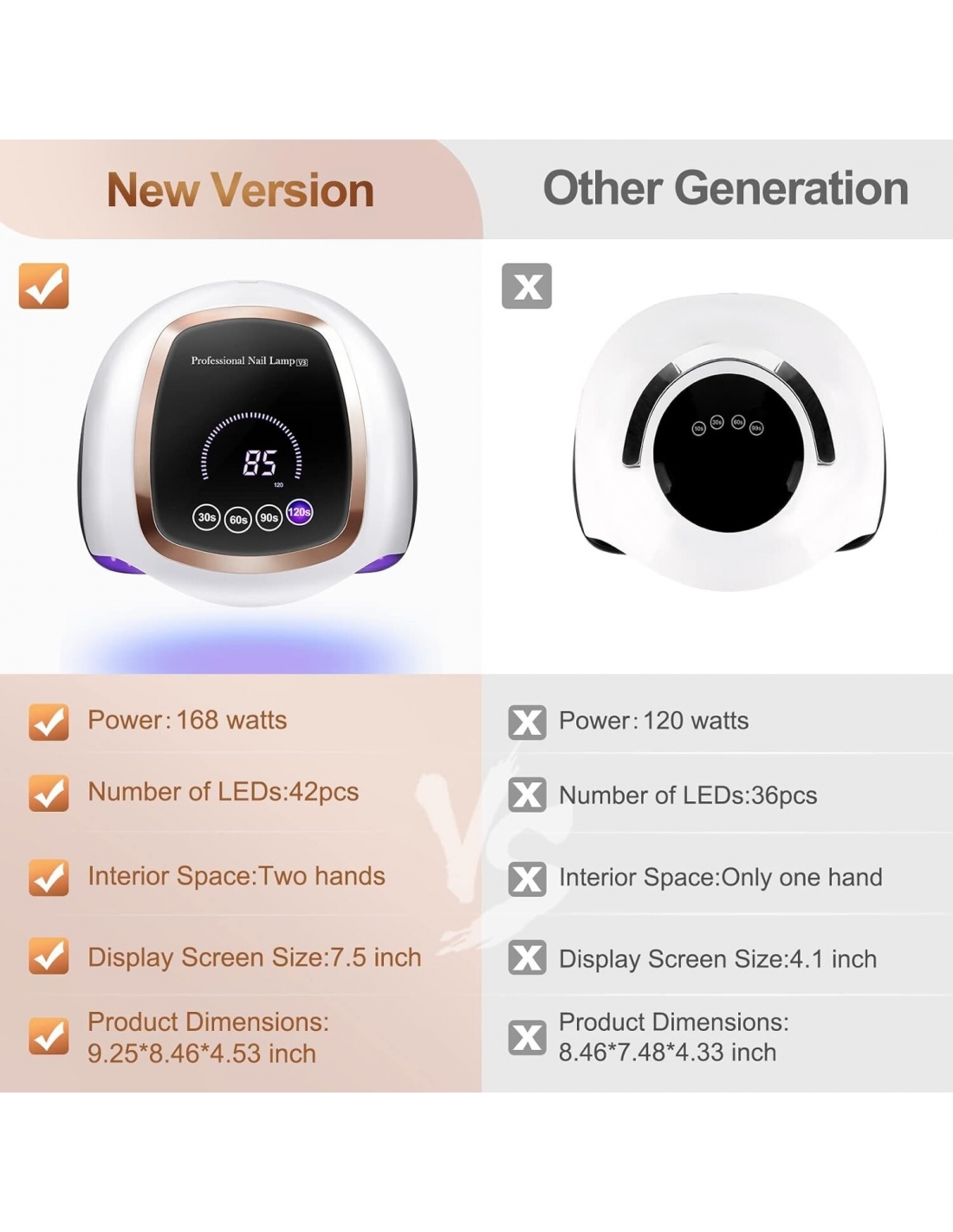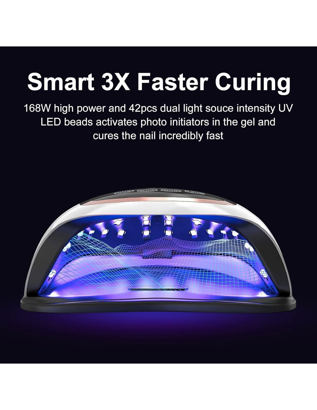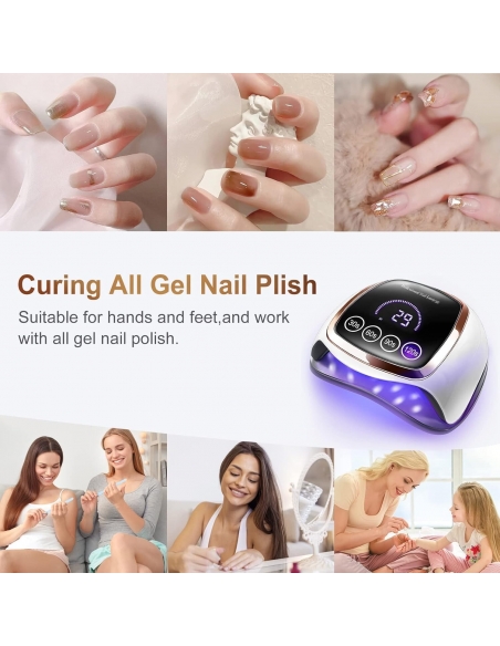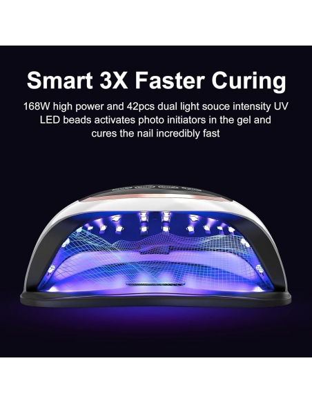 - Questa lampada unghie a LED da 168 W ha 42 perline di lampada di qualità, che adotta una tecnologia avanzata: doppia lunghezza d'onda della luce (365 + 405 nm), può ridurre l'intero tempo di polimerizzazione del 70% rispetto a altre lampade per unghie in gel. Le sue perle possiedono un'illuminazione multi-angolo di 180 °, nessuna zona morta, potente ed efficiente, nessun riflesso dannoso, nessuna mano nera.