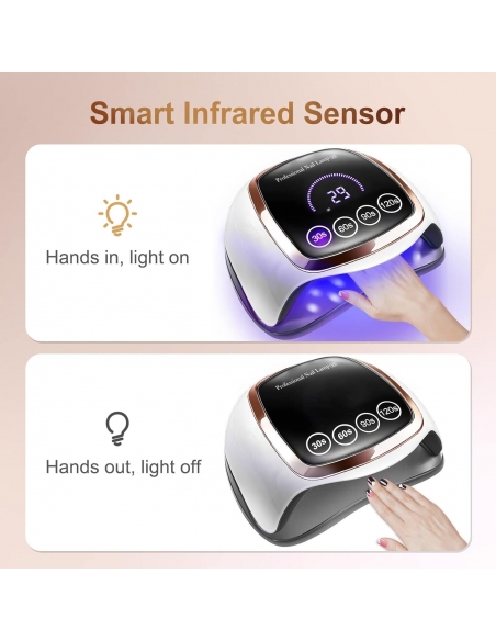 - La lampada uv è dotata di un sensore intelligente a infrarossi automatico di ultima generazione, può iniziare automaticamente a funzionare. Quando le tue mani entrano, accendi, mentre le mani fuori, spegni. La modalità di controllo facile da usare consente a tutti gli amanti delle unghie di utilizzare facilmente l'essiccatore per la cura delle unghie, che è anche più conveniente per gli amici per condividere la felicità del miglioramento delle unghie.