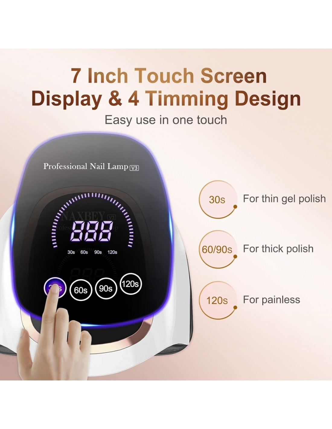 - L'ampio touch screen LCD da 7,5 pollici di questa fornetto unghie semipermanente UV mostra il tempo di utilizzo, il taglio con bordo dorato quadrato, sembra più raffinato, elegante e classico. Impostazione flessibile a 4 timer (modalità a bassa temperatura 30s/60s/90s/120s) per manicure esperti per scegliere rapidamente un tempo specifico per la polimerizzazione di uno smalto gel per unghie specifico.