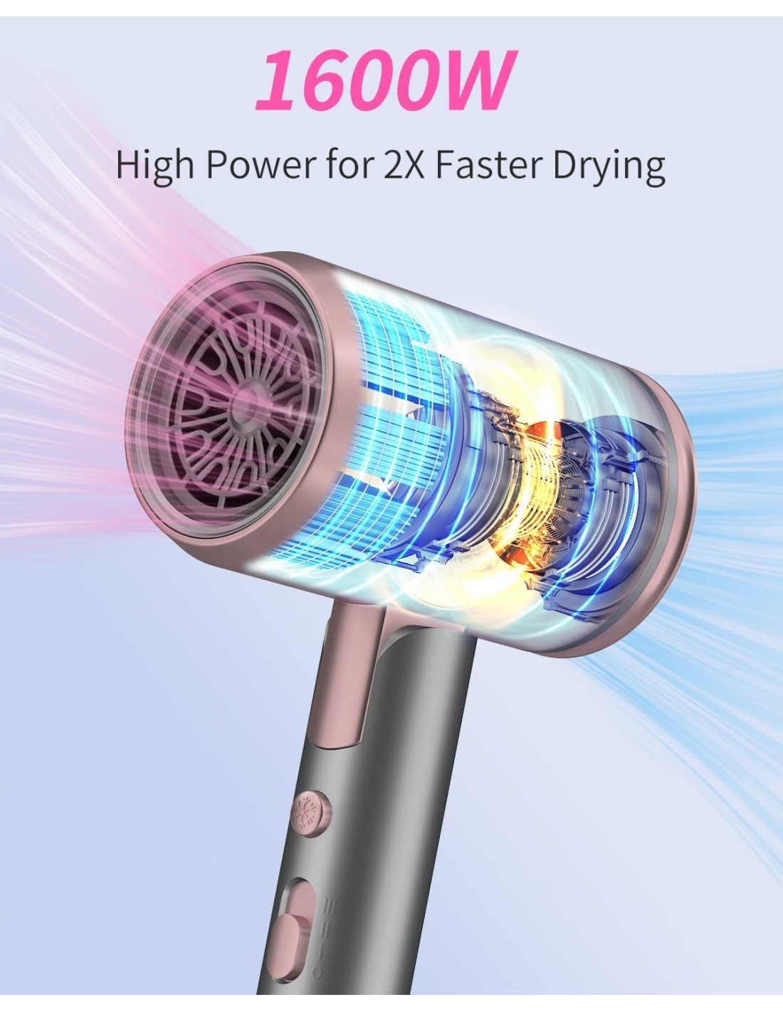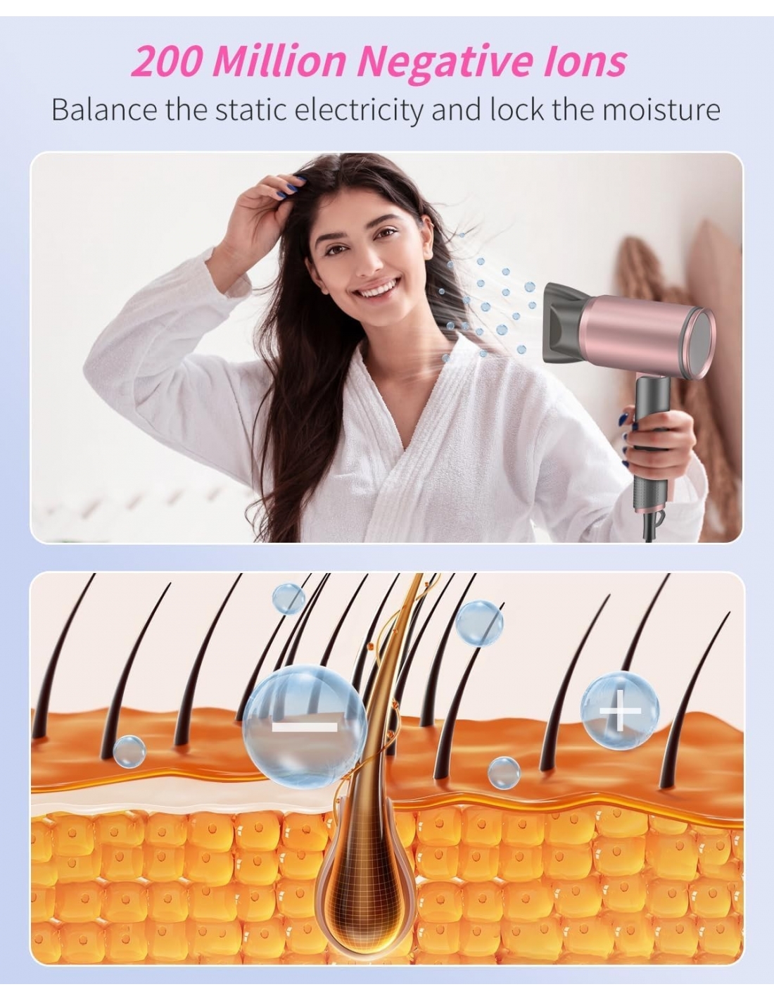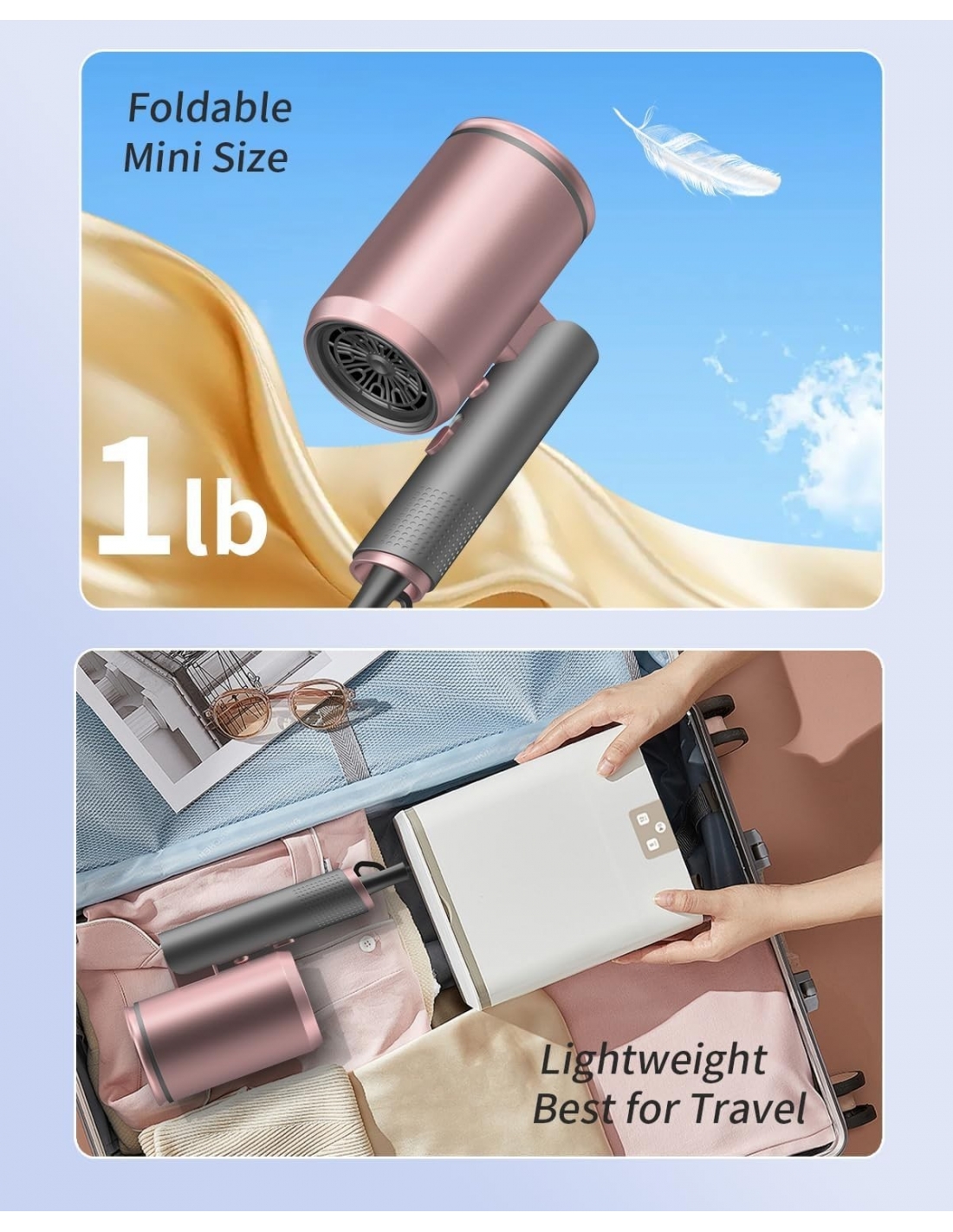 Vbrisi G888 Mini Asciugacapelli ionico pieghevole 2400 W da viaggio professionale con pulsante caldo/freddo 3 livelli di calore 3 velocità motore CA con diffusore e custodia