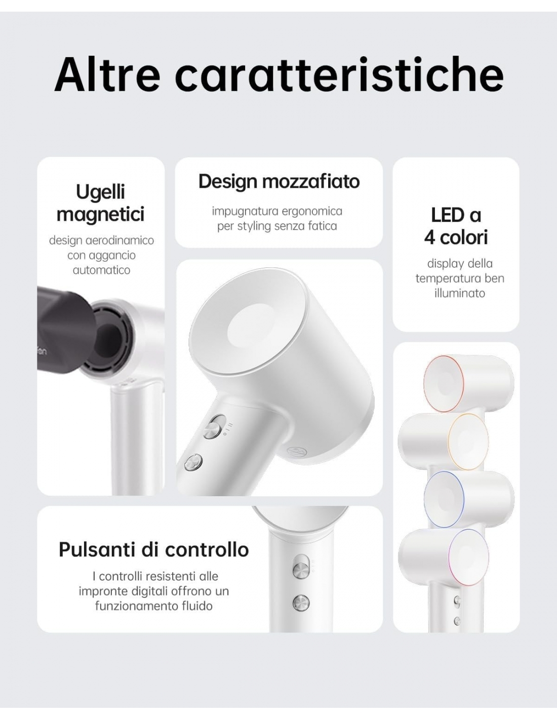 - 【Anello LED a 4 Colori & Basso Rumore】L'anello LED a 4 colori indica la temperatura: rosso per aria calda (80°C), giallo per aria tiepida (50°C) e blu per aria fredda. Tieni premuto per 2 secondi per attivare la modalità ciclica di temperatura. Il rumore è di soli 59 dB.